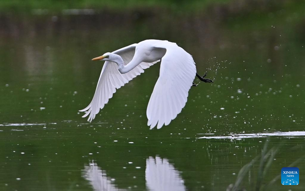 BEIJING, 11 agosto, 2025 (Xinhua) -- Imagen del 10 de agosto de 2025 de una garza volando sobre un río, en la ciudad de Tengzhou, en la provincia de Shandong, en el este de China. (Xinhua/Li Zhijun)