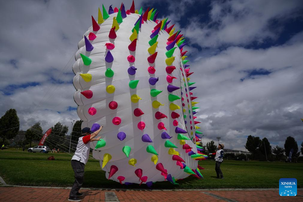 BOGOTA, 11 agosto, 2025 (Xinhua) -- Imagen del 10 de agosto de 2025 de personas moviendo un cometa gigante durante el Festival de Cometas en el marco del Festival de Verano de Bogotá, que este año tiene a China como país invitado de honor, en Bogotá, capital de Colombia. Miles de colombianos se sumaron a la exhibición de componentes de la cultura china realizada el domingo en el Festival de Cometas, llevado a cabo en el Parque Metropolitano El Tunal, en el sur de la capital de Colombia. (Xinhua/Andrés Moreno)