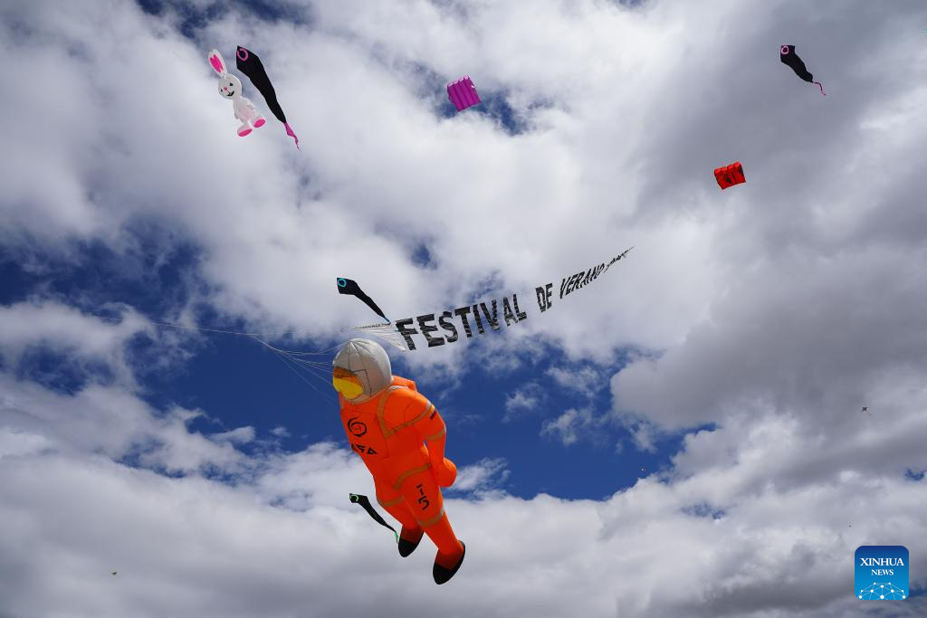 BOGOTA, 11 agosto, 2025 (Xinhua) -- Imagen del 10 de agosto de 2025 de cometas gigantes volando durante el Festival de Cometas en el marco del Festival de Verano de Bogotá, que este año tiene a China como país invitado de honor, en Bogotá, capital de Colombia. Miles de colombianos se sumaron a la exhibición de componentes de la cultura china realizada el domingo en el Festival de Cometas, llevado a cabo en el Parque Metropolitano El Tunal, en el sur de la capital de Colombia. (Xinhua/Andrés Moreno)