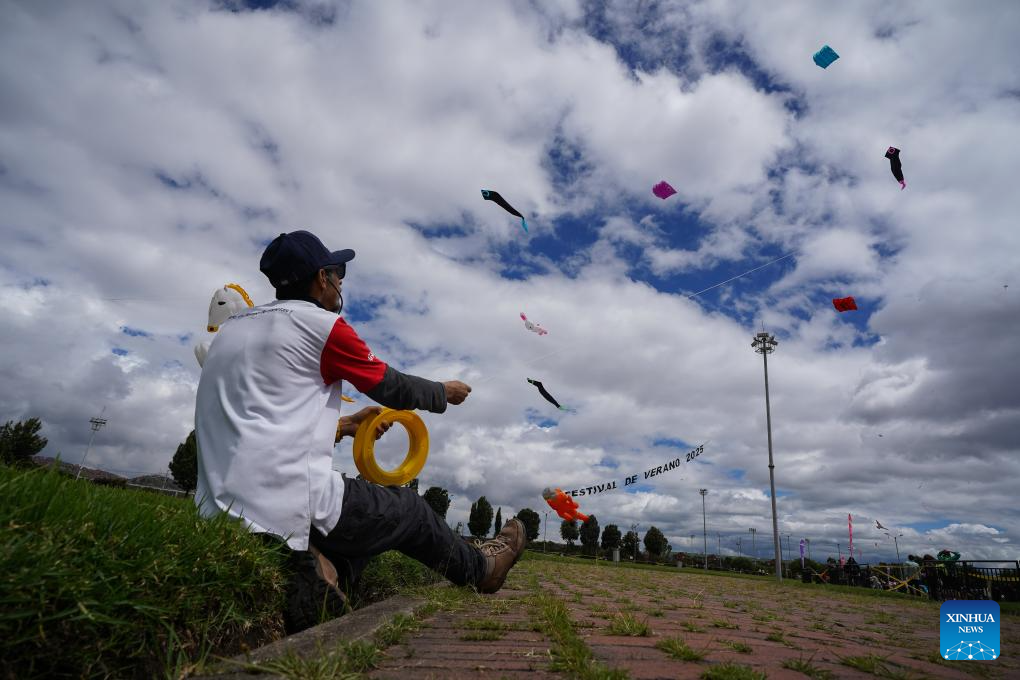 BOGOTA, 11 agosto, 2025 (Xinhua) -- Imagen del 10 de agosto de 2025 de un hombre volando un cometa gigante durante el Festival de Cometas en el marco del Festival de Verano de Bogotá, que este año tiene a China como país invitado de honor, en Bogotá, capital de Colombia. Miles de colombianos se sumaron a la exhibición de componentes de la cultura china realizada el domingo en el Festival de Cometas, llevado a cabo en el Parque Metropolitano El Tunal, en el sur de la capital de Colombia. (Xinhua/Andrés Moreno)