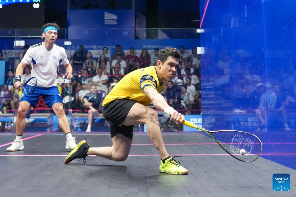 CHENGDU, 11 agosto, 2025 (Xinhua) -- Victor Crouin (d), de Francia, compite durante el partido de semifinal de individuales masculinos de Squash ante Miguel Rodríguez, de Colombia, en los Juegos Mundiales 2025, en Chengdu, en la provincia de Sichuan, en el suroeste de China, el 11 de agosto de 2025. (Xinhua/Li Xulun)