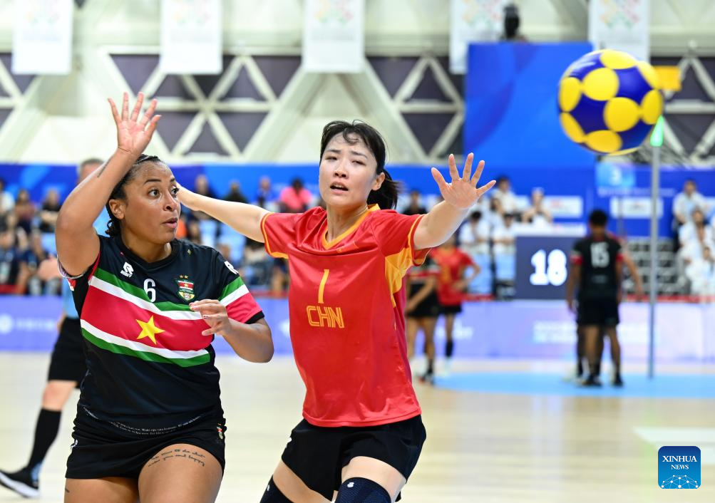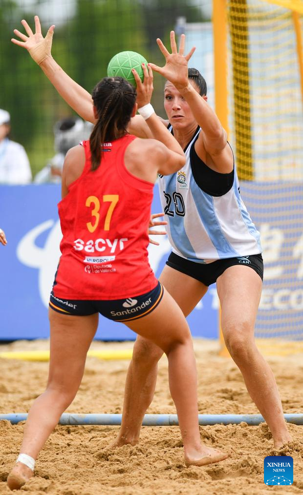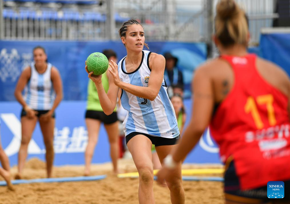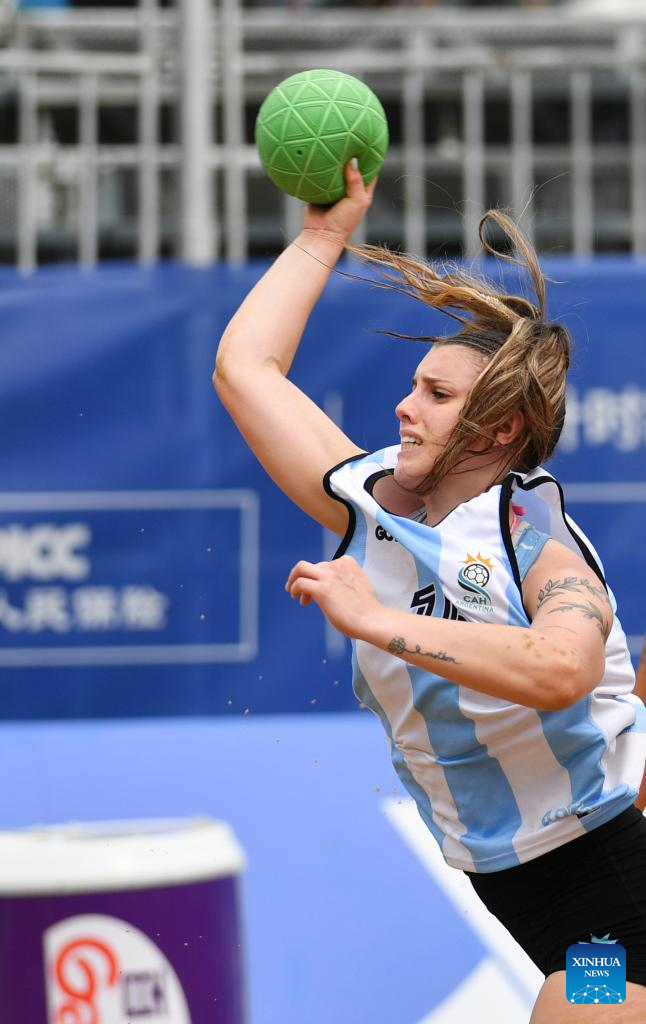 CHENGDU, 11 agosto, 2025 (Xinhua) -- Florencia Gallo, de Argentina, compite durante la semifinal femenina entre Argentina y España en el evento de balonmano playa de los Juegos Mundiales 2025, en Chengdu, en la provincia de Sichuan, en el suroeste de China, el 11 de agosto de 2025. (Xinhua/Zhang Bowen)