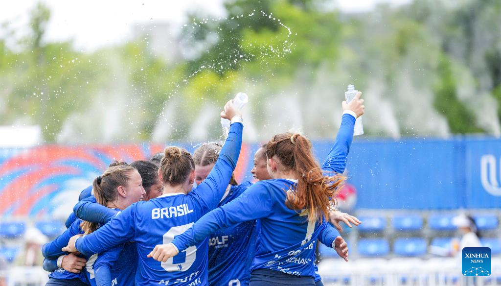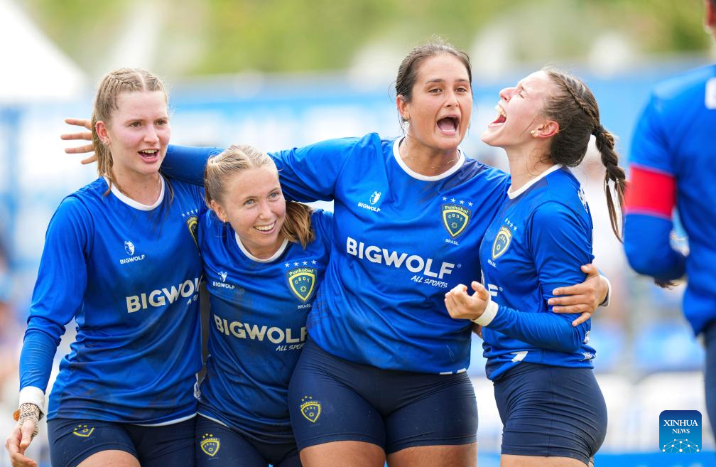 CHENGDU, 11 agosto, 2025 (Xinhua) -- El equipo de Brasil festeja la victoria en el partido del Grupo B de la ronda preliminar femenina de fistball entre Brasil y Alemania en los Juegos Mundiales 2025, en Chengdu, en la provincia de Sichuan, en el suroeste de China, el 11 de agosto de 2025. (Xinhua/Tenzin Nyida)