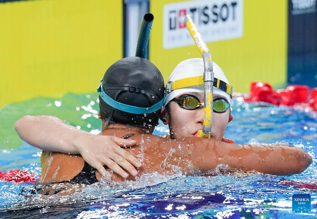 CHENGDU, 11 agosto, 2025 (Xinhua) -- Hu Yaoyao (d), del equipo de China, abraza a una atleta del equipo de Colombia, al término de la final femenina de relevos en superficie 4x50 m del evento de natación con aletas en los Juegos Mundiales 2025, celebrados en Chengdu, provincia de Sichuan, suroeste de China, el 11 de agosto de 2025. (Xinhua/Zhang Liyun)