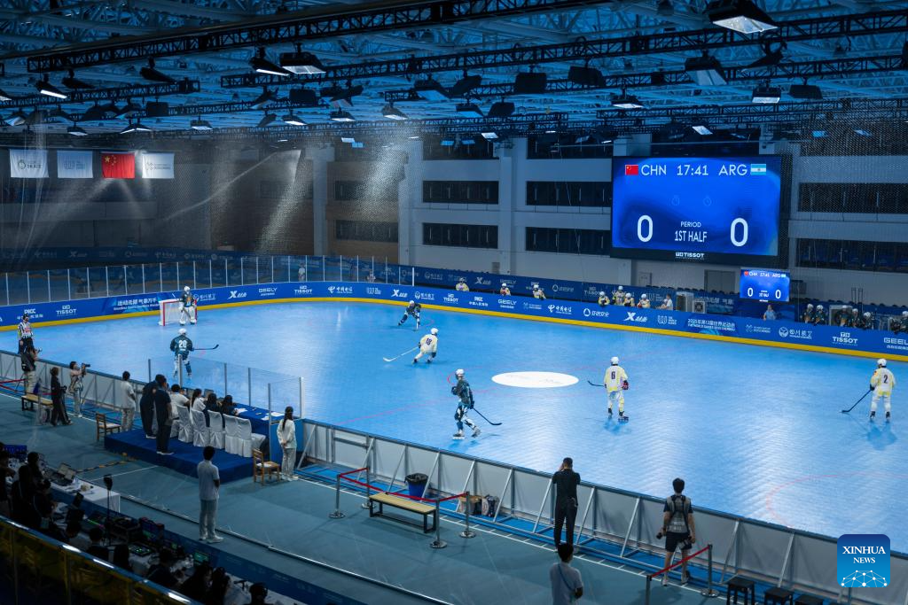 CHENGDU, 11 agosto, 2025 (Xinhua) -- Liu Chaoyi (2-d), de China, compite con Rodrigo Irisarri (d), de Argentina, durante el partido masculino por el séptimo lugar del evento de hockey en línea en los Juegos Mundiales 2025, en Chengdu, en la provincia de Sichuan, en el suroeste de China, el 11 de agosto de 2025. (Xinhua/Xie Jianfei)