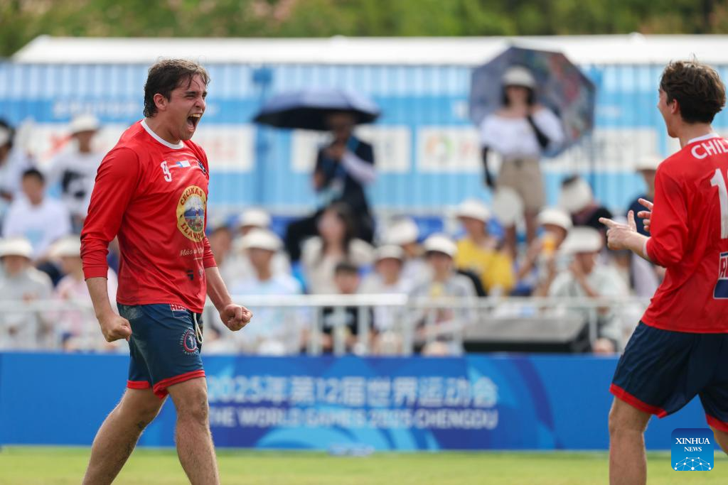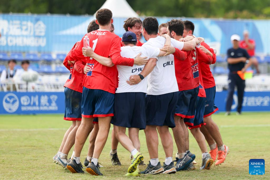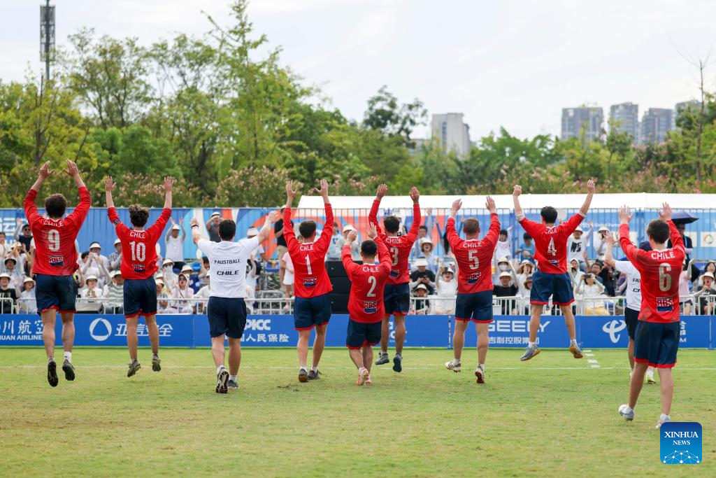 CHENGDU,11 agosto, 2025 (Xinhua) -- Jugadores de Chile festejan al término del partido del Grupo B de la ronda preliminar masculina de fistball entre Chile y Argentina en los Juegos Mundiales 2025, en Chengdu, en la provincia de Sichuan, en el suroeste de China, el 11 de agosto de 2025. (Xinhua/Wang Xiang)