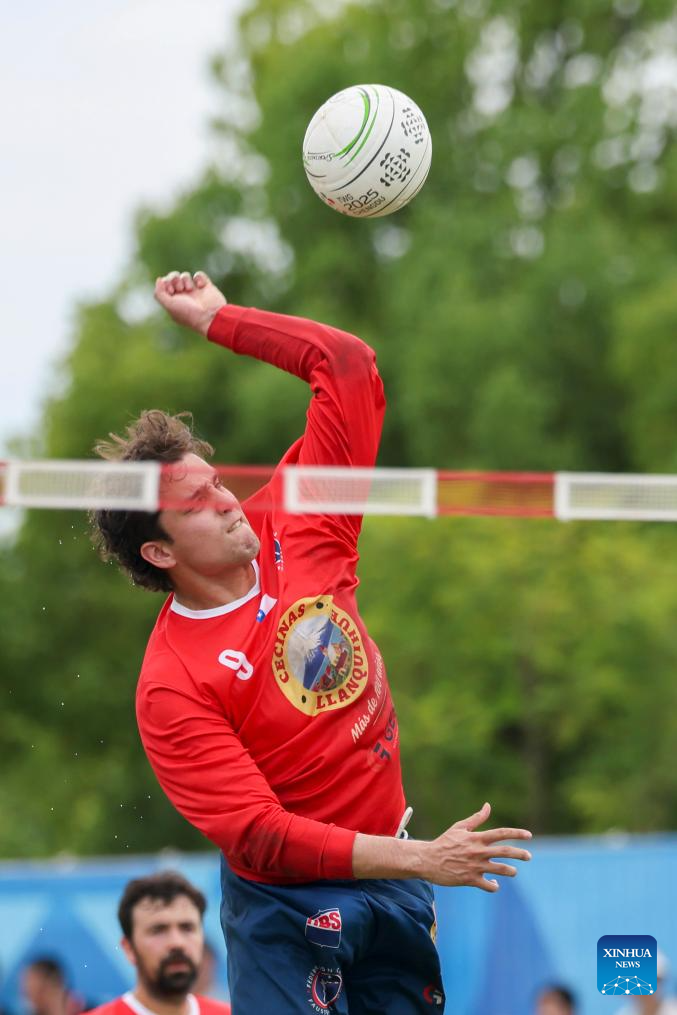 CHENGDU,11 agosto, 2025 (Xinhua) -- Andrés Gruss, de Chile, compite durante el partido del Grupo B de la ronda preliminar masculina de fistball entre Chile y Argentina en los Juegos Mundiales 2025, en Chengdu, en la provincia de Sichuan, en el suroeste de China, el 11 de agosto de 2025. (Xinhua/Wang Xiang)