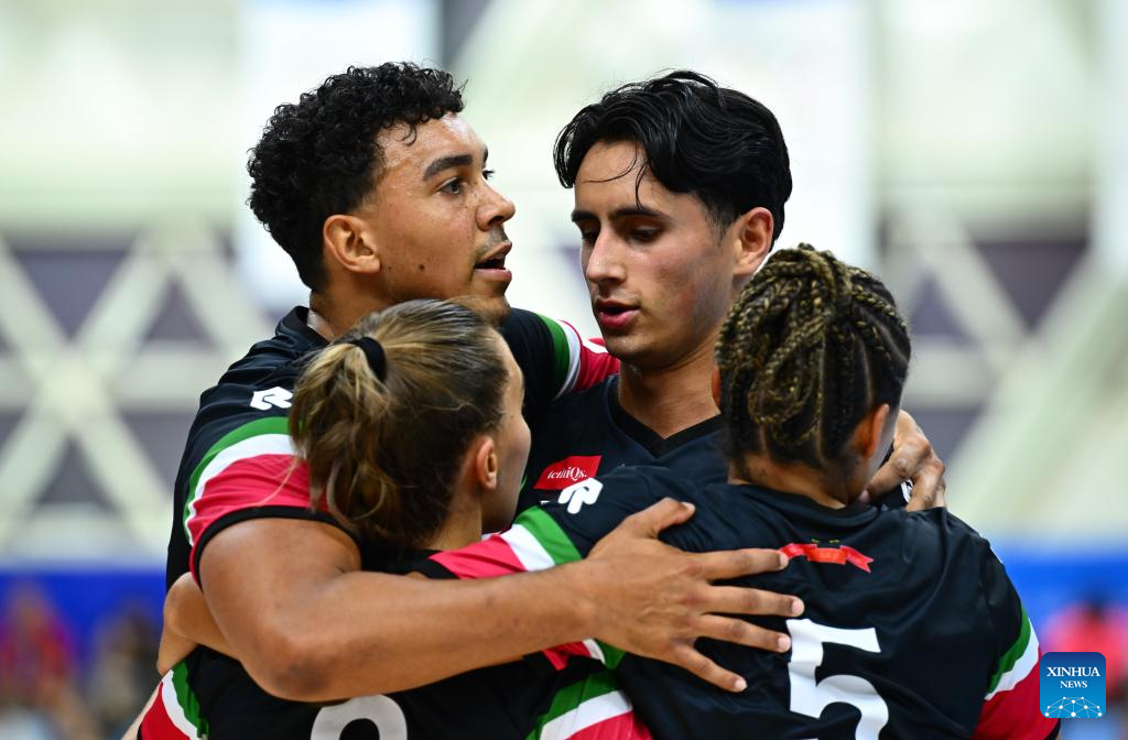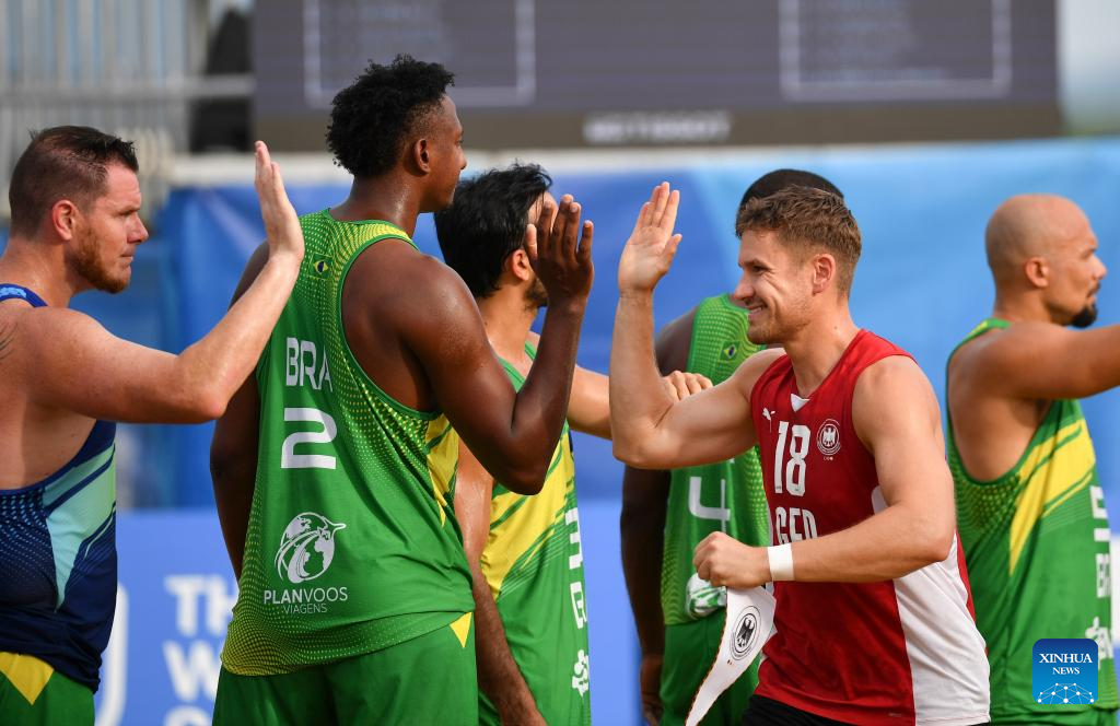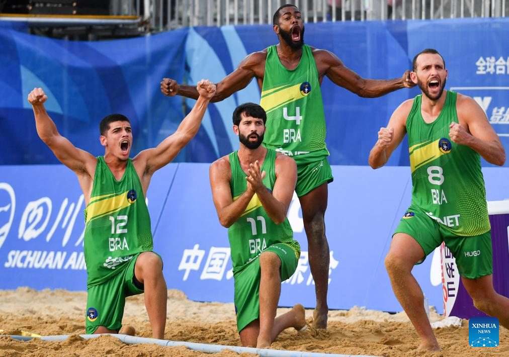 CHENGDU, 11 agosto, 2025 (Xinhua) -- Jugadores de Brasil festejan durante la semifinal masculina entre Alemania y Brasil del evento de balonmano de playa en los Juegos Mundiales 2025, en Chengdu, en la provincia de Sichuan, en el suroeste de China, el 11 de agosto de 2025. (Xinhua/Zhang Bowen)