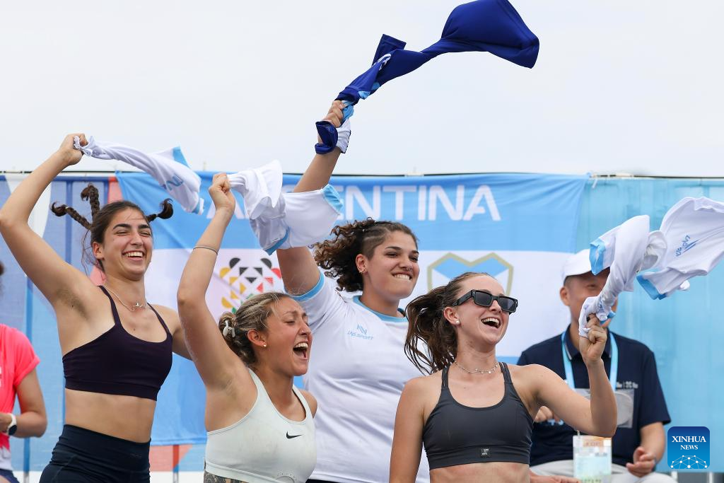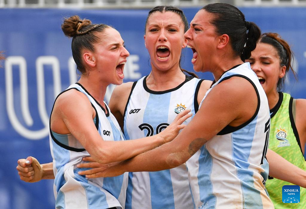 CHENGDU, 11 agosto, 2025 (Xinhua) -- Jugadoras de Argentina festejan durante la semifinal femenina entre Argentina y España en el evento de balonmano de playa de los Juegos Mundiales 2025, en Chengdu, en la provincia de Sichuan, en el suroeste de China, el 11 de agosto de 2025. (Xinhua/Zhang Bowen)