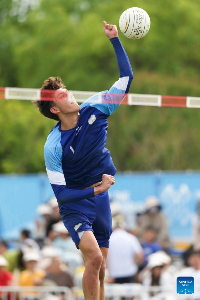 CHENGDU,11 agosto, 2025 (Xinhua) -- Nahuel Ezequiel Vener, de Argentina, compite durante el partido del Grupo B de la ronda preliminar masculina de fistball entre Chile y Argentina en los Juegos Mundiales 2025, en Chengdu, en la provincia de Sichuan, en el suroeste de China, el 11 de agosto de 2025. (Xinhua/Wang Xiang)