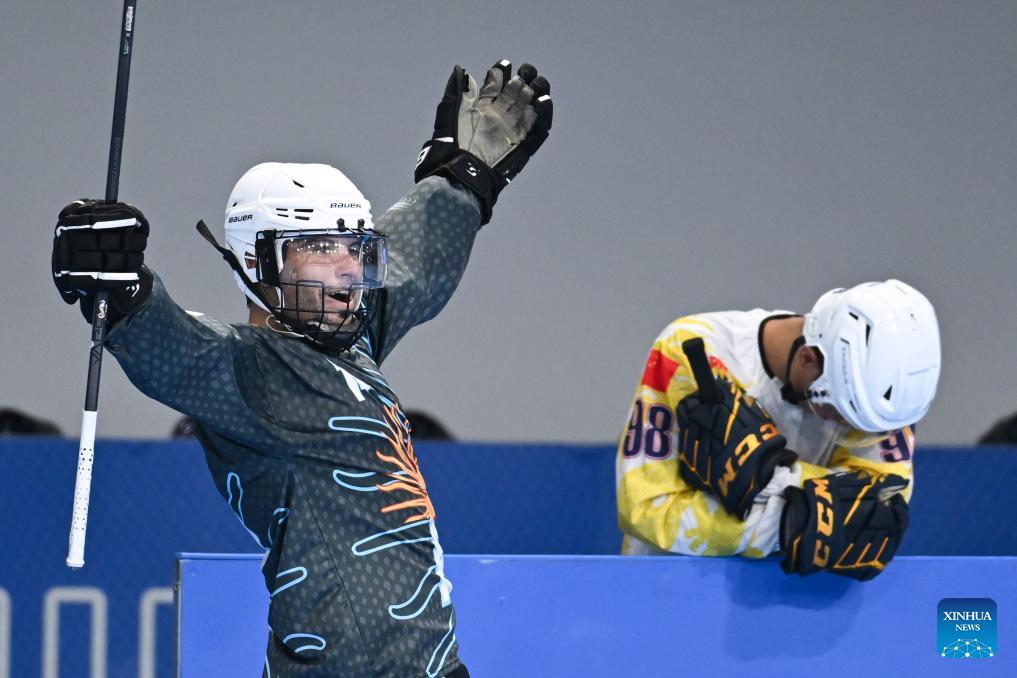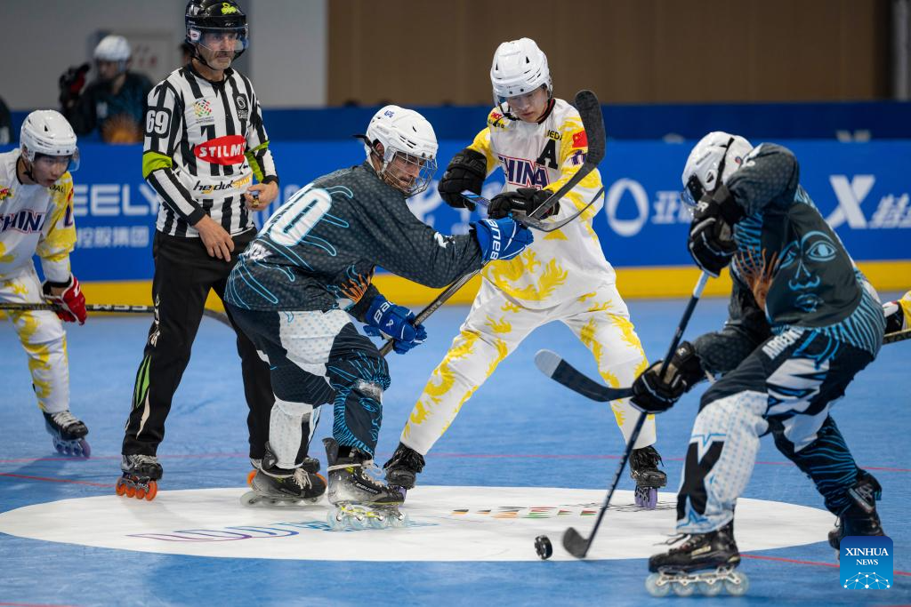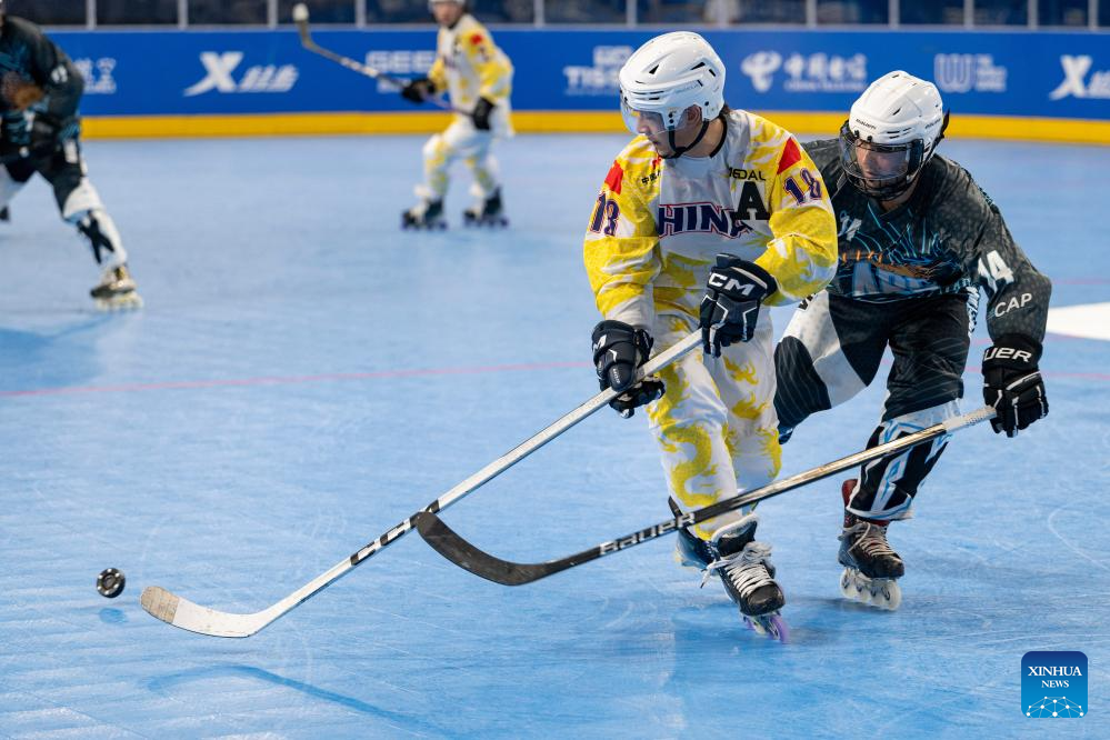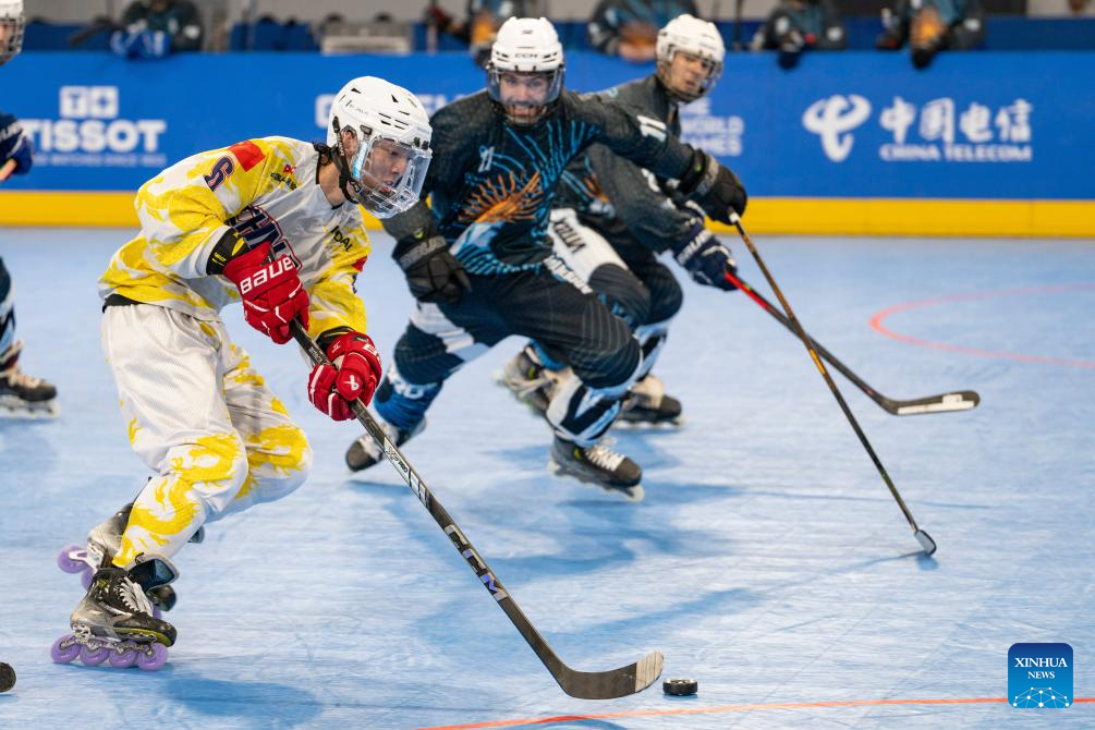 CHENGDU, 11 agosto, 2025 (Xinhua) -- Zhuang Haojie (i), de China, compite durante el partido masculino por el séptimo lugar del evento de hockey en línea en los Juegos Mundiales 2025, en Chengdu, en la provincia de Sichuan, en el suroeste de China, el 11 de agosto de 2025. (Xinhua/Xie Jianfei)
