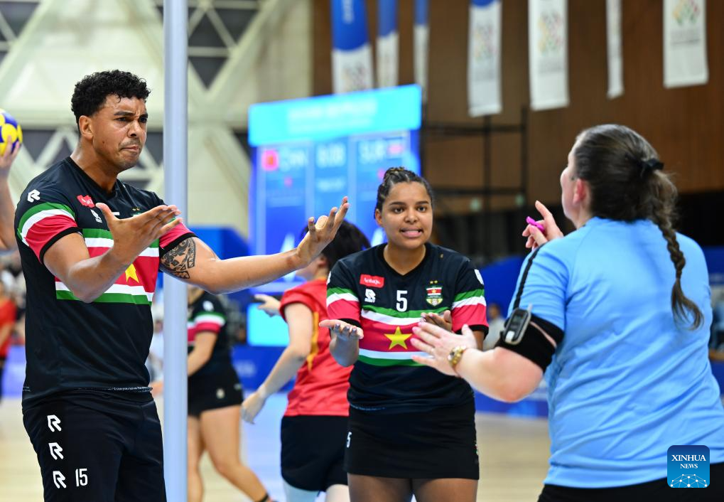 CHENGDU, 11 agosto, 2025 (Xinhua) -- Jugadores de Surinam conversan con la árbitro durante el partido de semifinal de consolación 5-8 por equipos mixtos de Korfball entre China y Surinam, en los Juegos Mundiales 2025, en Chengdu, en la provincia de Sichuan, en el suroeste de China, el 11 de agosto de 2025. (Xinhua/Jiang Kehong)