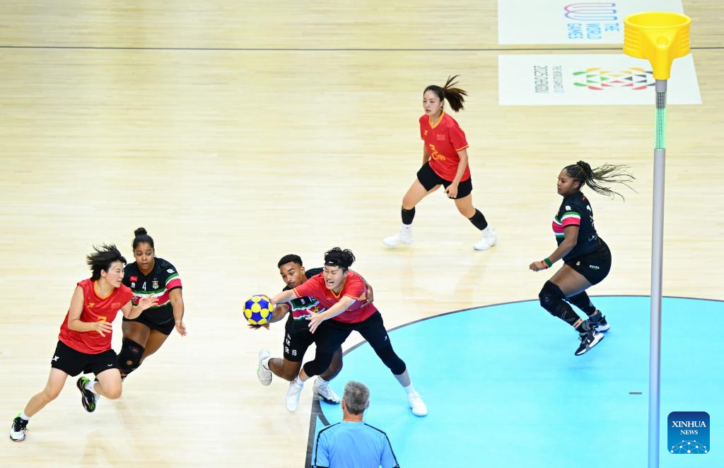 CHENGDU, 11 agosto, 2025 (Xinhua) -- Fiorella Corimberto (i), de Argentina, compite durante la semifinal femenina entre Argentina y España en el evento de balonmano de playa de los Juegos Mundiales 2025, en Chengdu, en la provincia de Sichuan, en el suroeste de China, el 11 de agosto de 2025. (Xinhua/Zhang Bowen)