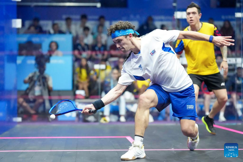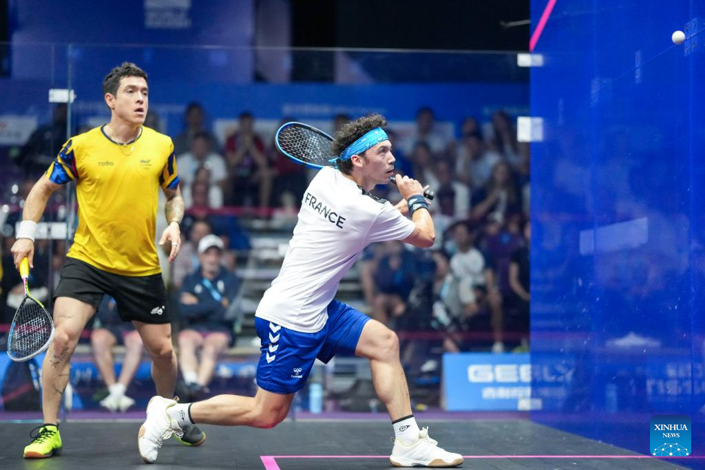CHENGDU, 11 agosto, 2025 (Xinhua) -- Victor Crouin (i), de Francia, compite durante el partido de semifinal de individuales masculinos de Squash ante Miguel Rodríguez, de Colombia en los Juegos Mundiales 2025, en Chengdu, en la provincia de Sichuan, en el suroeste de China, el 11 de agosto de 2025. (Xinhua/Li Xulun)