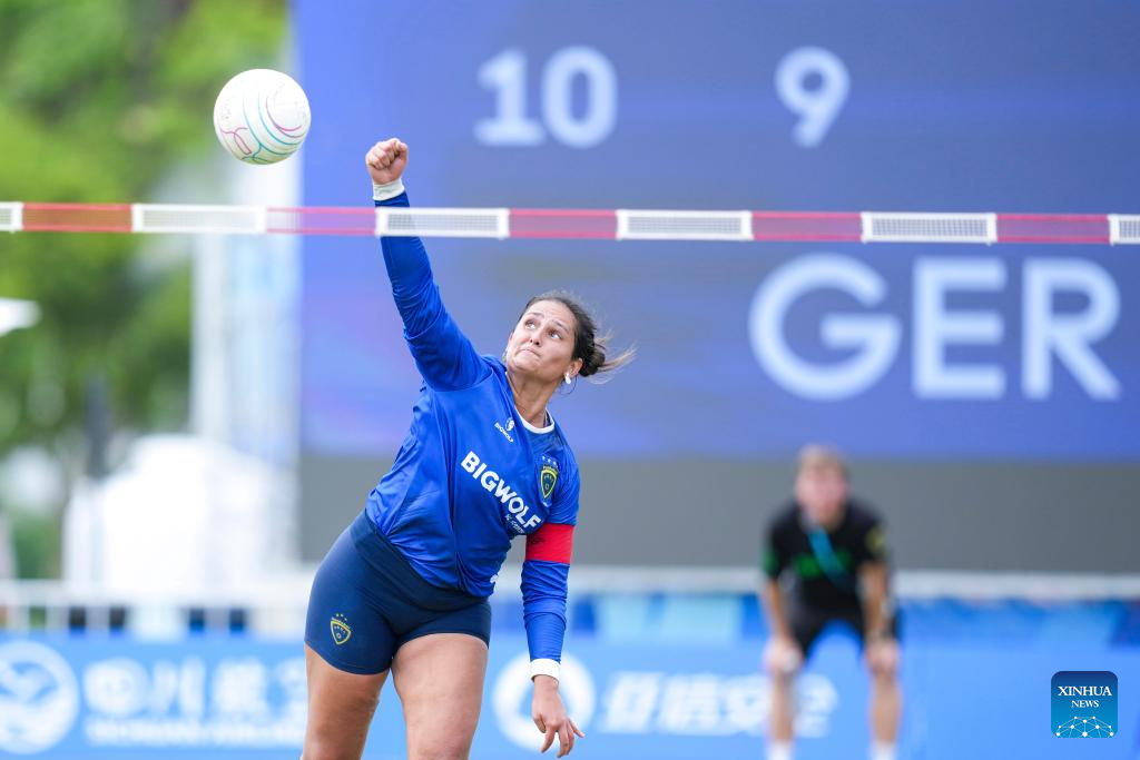 CHENGDU, 11 agosto, 2025 (Xinhua) -- Sabine Suffert, de Brasil, golpea la pelota durante el partido del Grupo B de la ronda preliminar femenina de fistball entre Brasil y Alemania en los Juegos Mundiales 2025, en Chengdu, en la provincia de Sichuan, en el suroeste de China, el 11 de agosto de 2025. (Xinhua/Tenzin Nyida)