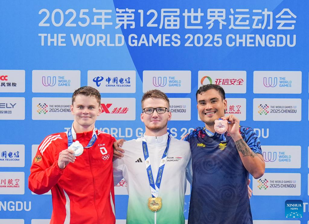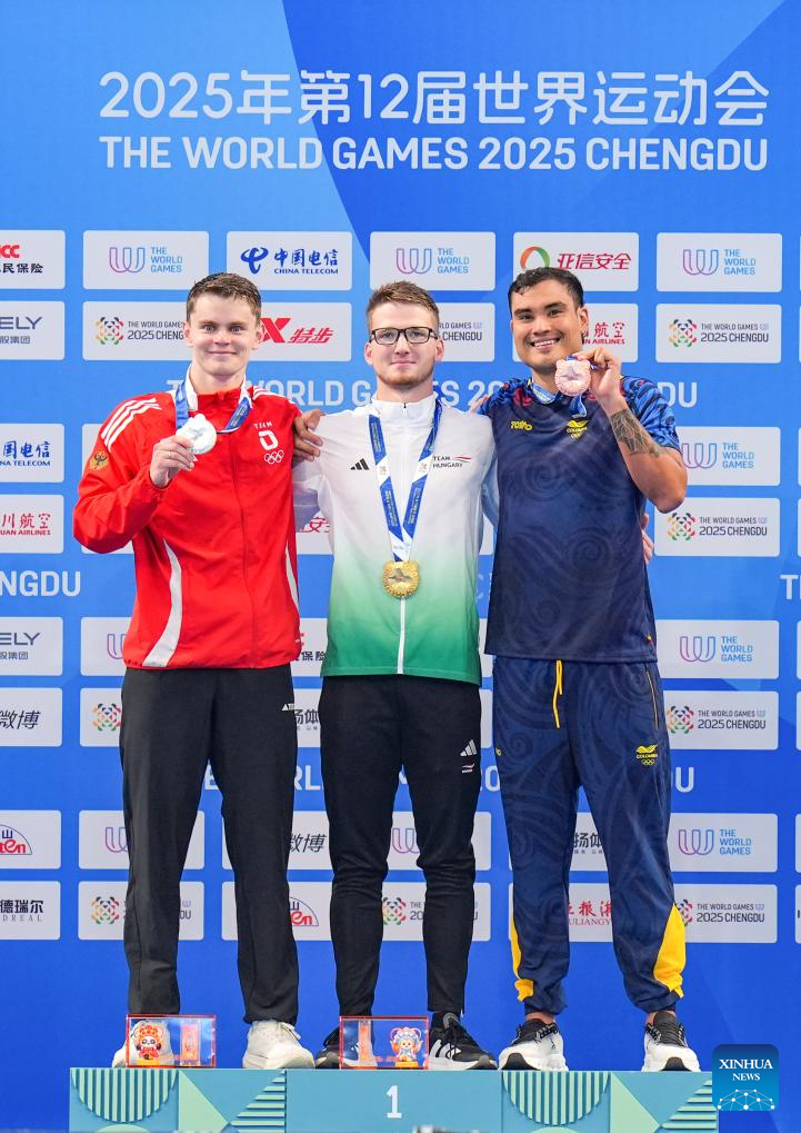 CHENGDU, 11 agosto, 2025 (Xinhua) -- El medallista de oro, Nandor Kiss (c), de Hungría, el medallista de plata, Justus Moerstedt (i), de Alemania, y el medallista de bronce, Juan Fernando Ocampo Lozada, de Colombia, posan durante la ceremonia de premiación de la final masculina en superficie de 200m del evento de natación con aletas en los Juegos Mundiales 2025, en Chengdu, en la provincia de Sichuan, en el suroeste de China, el 11 de agosto de 2025. (Xinhua/Wang Xi)