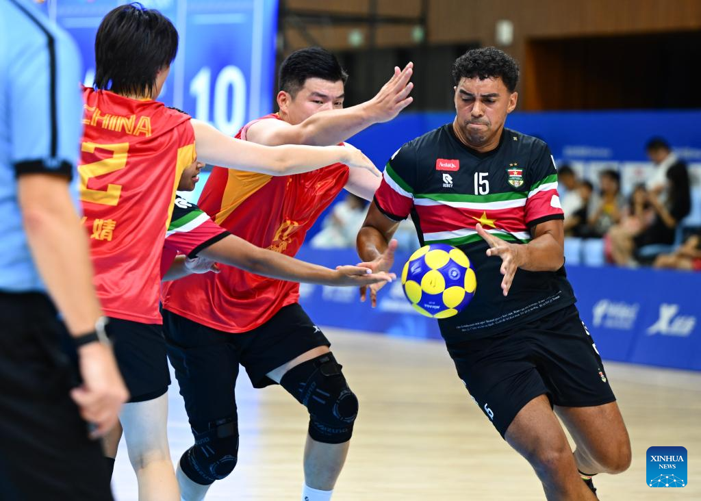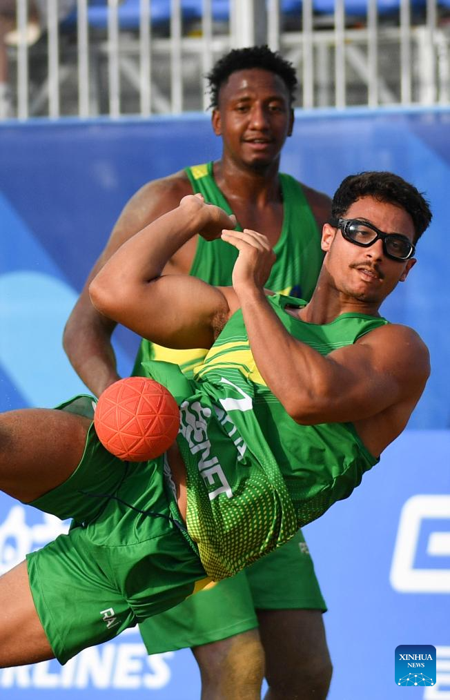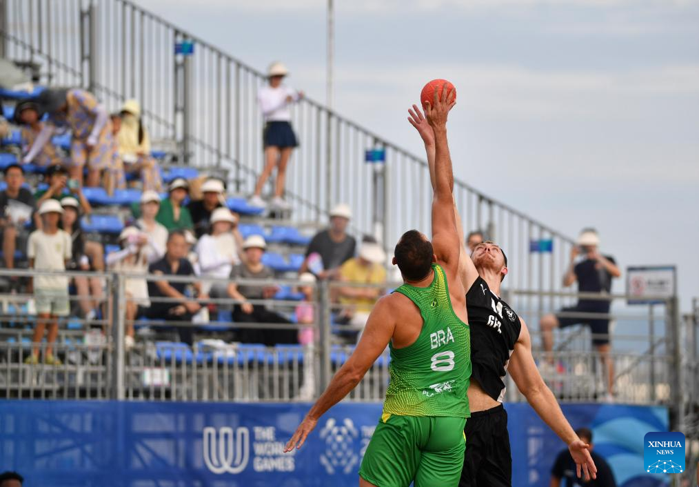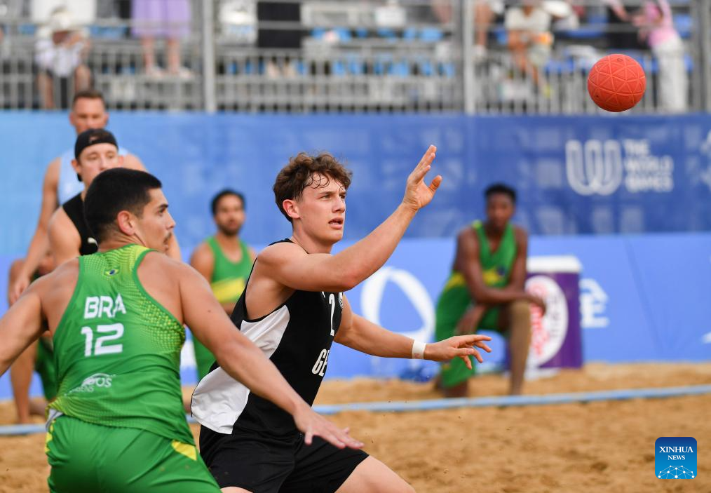 CHENGDU, 11 agosto, 2025 (Xinhua) -- Rai Goncalves (frente), de Brasil, compite durante la semifinal masculina entre Alemania y Brasil del evento de balonmano de playa en los Juegos Mundiales 2025, en Chengdu, en la provincia de Sichuan, en el suroeste de China, el 11 de agosto de 2025. (Xinhua/Zhang Bowen)