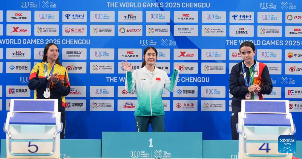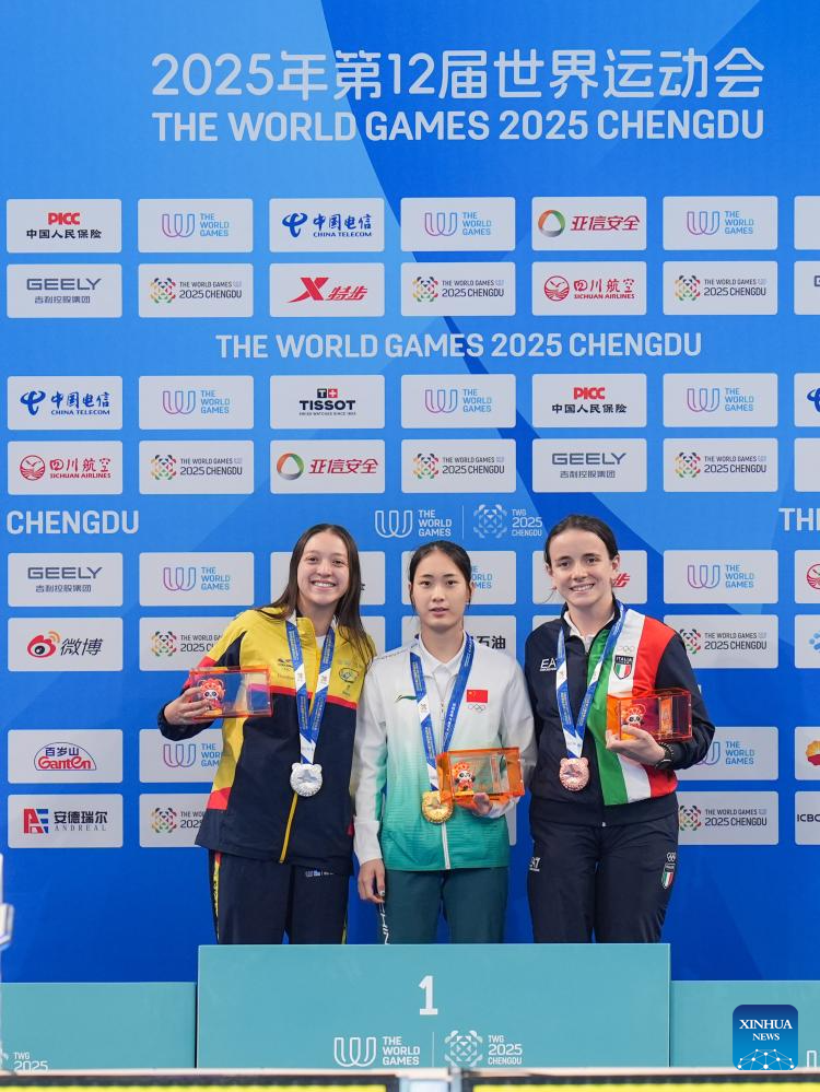 CHENGDU, 11 agosto, 2025 (Xinhua) -- La medallista de oro, Huang Jingqiu (c), de China, la medallista de plata, María Carolina Rodríguez Angarita (i), de Colombia, y la medallista de bronce, Marta Pozzi, de Italia, posan con sus medallas durante la ceremonia de premiación de la final de dinámica femenina sin aletas - FFS1-FFS2 del evento de apnea en los Juegos Mundiales 2025, en Chengdu, en la provincia de Sichuan, en el suroeste de China, el 11 de agosto de 2025. (Xinhua/Wang Xi)