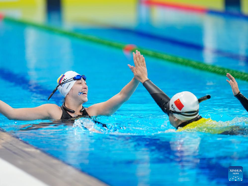 CHENGDU, 11 agosto, 2025 (Xinhua) -- María Carolina Rodríguez Angarita (i), de Colombia, choca las manos con un salvavidas, al término de la final de dinámica femenina sin aletas - FFS1-FFS2 del evento de apnea en los Juegos Mundiales 2025, en Chengdu, en la provincia de Sichuan, en el suroeste de China, el 11 de agosto de 2025. (Xinhua/Wang Xi)