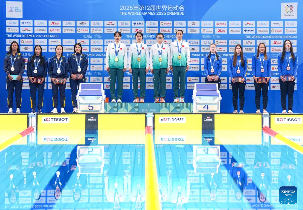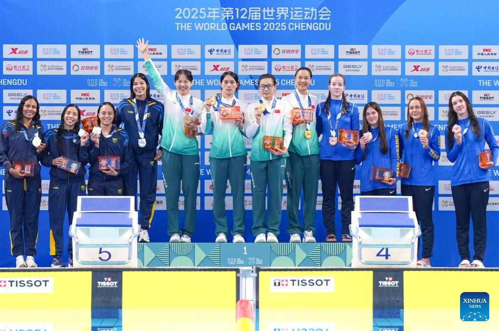 CHENGDU, 11 agosto, 2025 (Xinhua) -- El equipo de medallistas de oro de China (c), el equipo de medallistas de plata de Colombia (i), y el equipo de medallistas de bronce de Ucrania, asisten a la ceremonia de premiación al término de la final femenina de relevos en superficie 4x50 m del evento de natación con aletas en los Juegos Mundiales 2025, celebrados en Chengdu, provincia de Sichuan, suroeste de China, el 11 de agosto de 2025. (Xinhua/Zhang Liyun)
