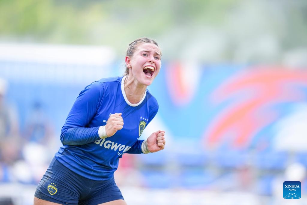 CHENGDU, 11 agosto, 2025 (Xinhua) -- Julia Hoberrek, de Brasil, festeja la victoria en el partido del Grupo B de la ronda preliminar femenina de fistball entre Brasil y Alemania en los Juegos Mundiales 2025, en Chengdu, en la provincia de Sichuan, en el suroeste de China, el 11 de agosto de 2025. (Xinhua/Tenzin Nyida)
