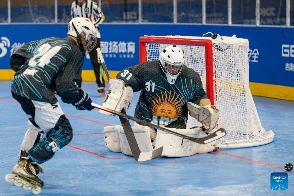 CHENGDU, 11 agosto, 2025 (Xinhua) -- Gaspar López Silva (d), guardameta de Argentina, defiende durante el partido masculino por el séptimo lugar del evento de hockey en línea en los Juegos Mundiales 2025, en Chengdu, en la provincia de Sichuan, en el suroeste de China, el 11 de agosto de 2025. (Xinhua/Xie Jianfei)