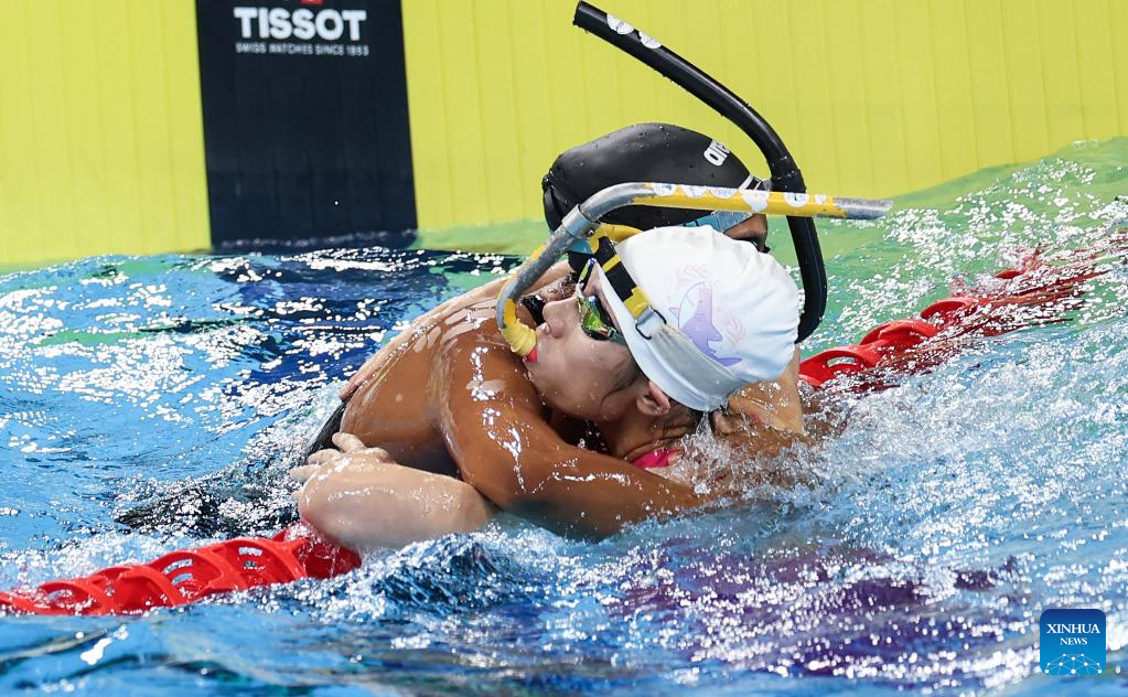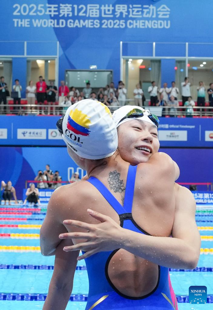 CHENGDU, 11 agosto, 2025 (Xinhua) -- Hu Yaoyao (d), del equipo de China, abraza a Diana Paola Moreno Alegría, del equipo de Colombia, al término de la final femenina de relevos en superficie 4x50 m del evento de natación con aletas en los Juegos Mundiales 2025, celebrados en Chengdu, provincia de Sichuan, suroeste de China, el 11 de agosto de 2025. (Xinhua/Zhang Liyun)