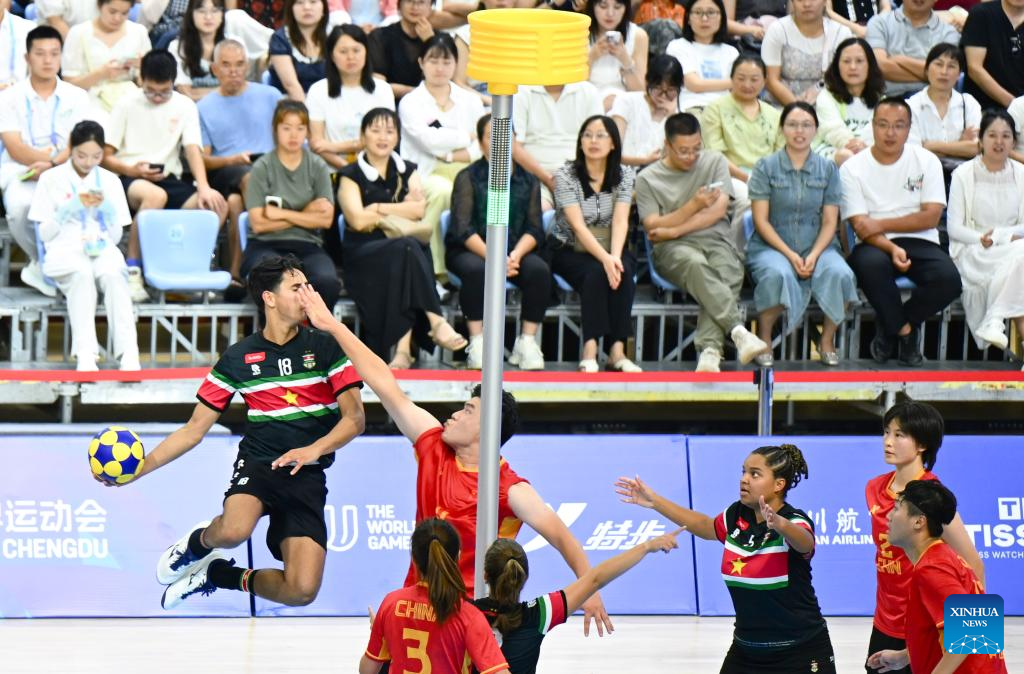 CHENGDU, 11 agosto, 2025 (Xinhua) -- Jugadores compiten durante el partido de semifinal de consolación 5-8 por equipos mixtos de Korfball entre China y Surinam, en los Juegos Mundiales 2025, en Chengdu, en la provincia de Sichuan, en el suroeste de China, el 11 de agosto de 2025. (Xinhua/Jiang Kehong)