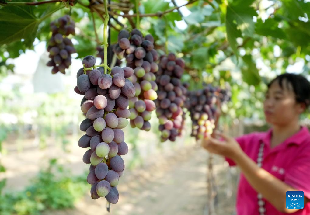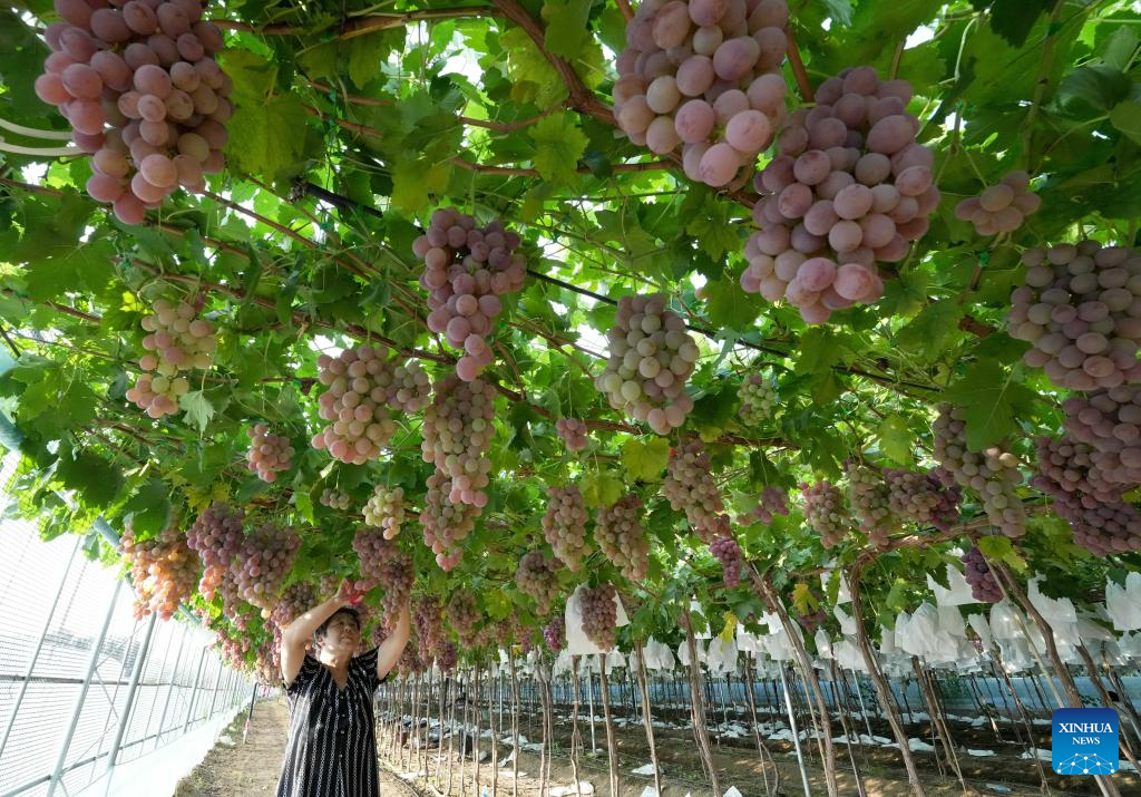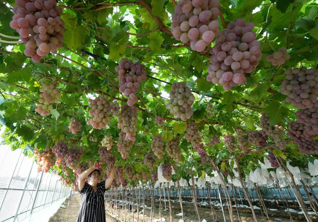 SHIJIAZHUANG, 13 agosto, 2025 (Xinhua) -- Imagen del 12 de agosto de 2025 de una agricultora revisando el crecimiento de las uvas, en la aldea de Baozigou, en el distrito de Lulong, en la provincia de Hebei, en el norte de China. La aldea de Baozigou en el distrito de Lulong tiene una historia de más de 600 años en el cultivo de la uva y actualmente cuenta con una superficie total de plantación de más de 1.500 mu (100 hectáreas) con docenas de variedades de uva de alta calidad. (Xinhua/Yang Shiyao)