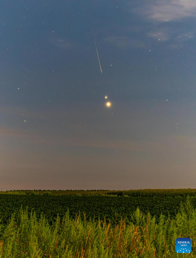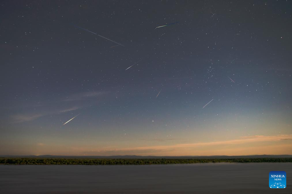 HARBIN, 13 agosto, 2025 (Xinhua) -- Imagen del 13 de agosto de 2025 de una lluvia de meteoros perseidas sobre el distrito de Tangyuan de la ciudad de Jiamusi, en la provincia de Heilongjiang, en el noreste de China. La lluvia anual de meteoros perseidas alcanzó su punto máximo el miércoles. (Xinhua/Chen Zhiguo)