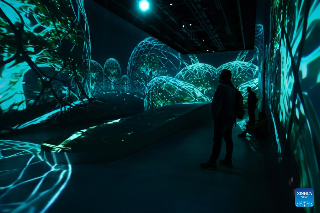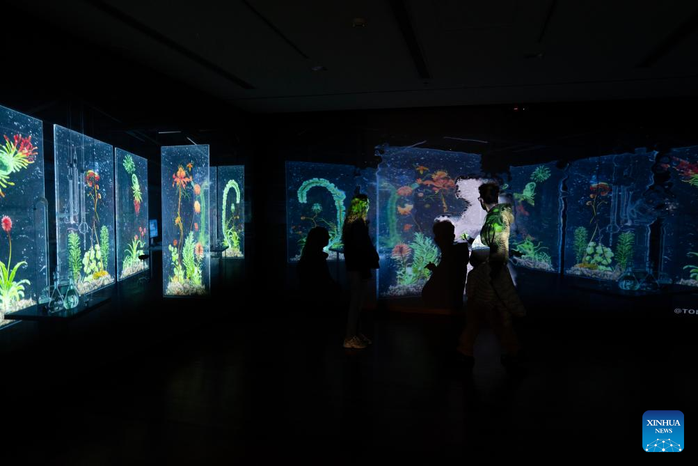 BUENOS AIRES, 13 agosto, 2025 (Xinhua) -- Personas observan la experiencia inmersiva Ecos de la convergencia: Viaje inmersivo a la naturaleza sintética, en el marco de la exhibición Rituales Tecnológicos II en el Palacio Libertad, en la ciudad de Buenos Aires, capital de Argentina, el 13 de agosto de 2025. (Xinhua/Martín Zabala)