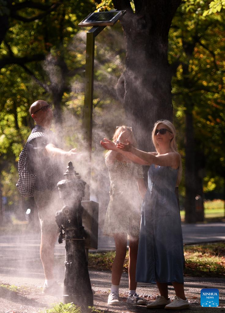 VIENA, 14 agosto, 2025 (Xinhua) -- Personas se refrescan en un sistema de enfriamiento por rocío en medio de una ola de calor, en Viena, Austria, el 14 de agosto de 2025. (Xinhua/He Canling)