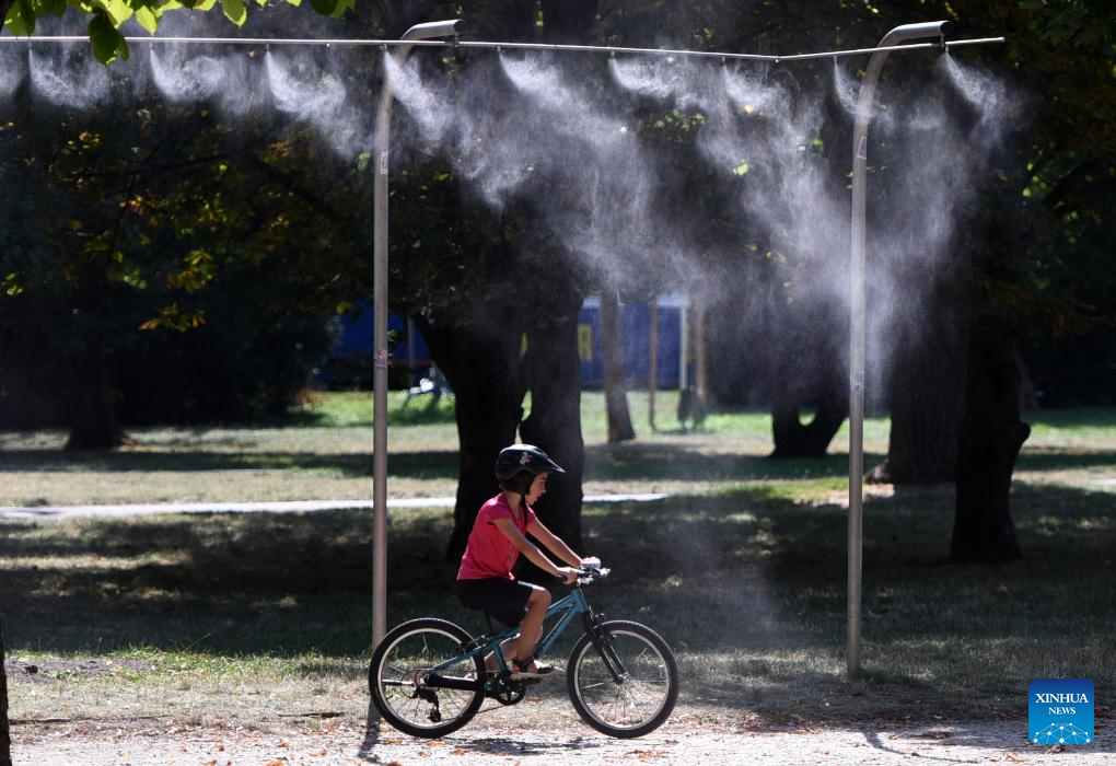 VIENA, 14 agosto, 2025 (Xinhua) -- Un niño monta una bicicleta bajo un sistema de enfriamiento por rocío en medio de una ola de calor, en Viena, Austria, el 14 de agosto de 2025. (Xinhua/He Canling)