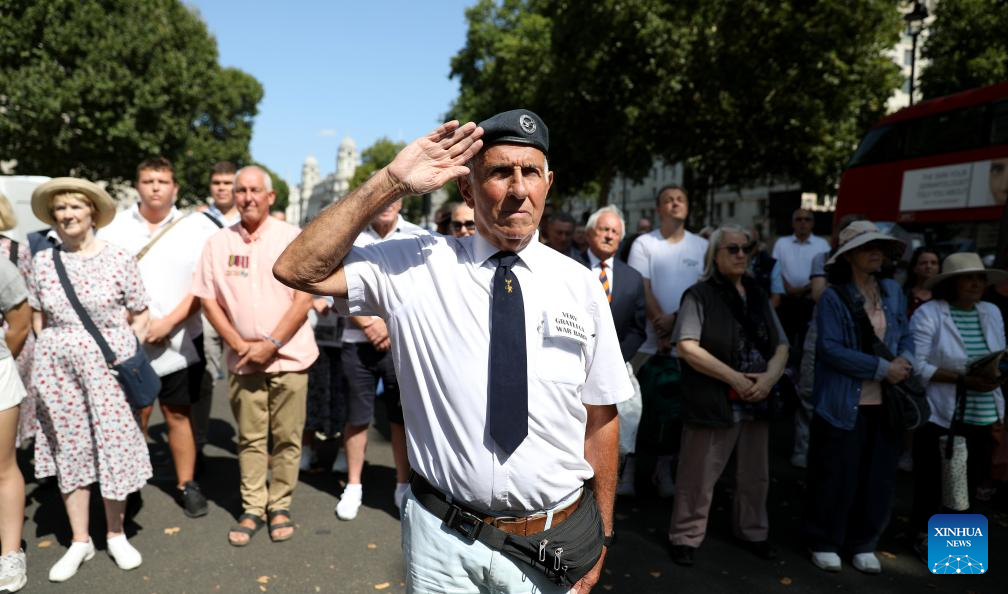 LONDRES, 16 agosto, 2025 (Xinhua) -- Imagen del 15 de agosto de 2025 de un veterano saludando frente al Cenotafio durante un silencio nacional de dos minutos, en Londres, Reino Unido. El viernes se celebró en Reino Unido el 80° aniversario del Día de la Victoria sobre Japón con una serie de eventos. (Xinhua/Li Ying)