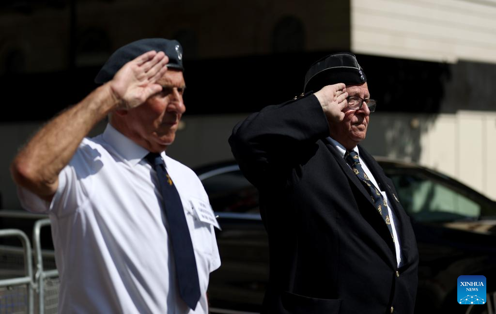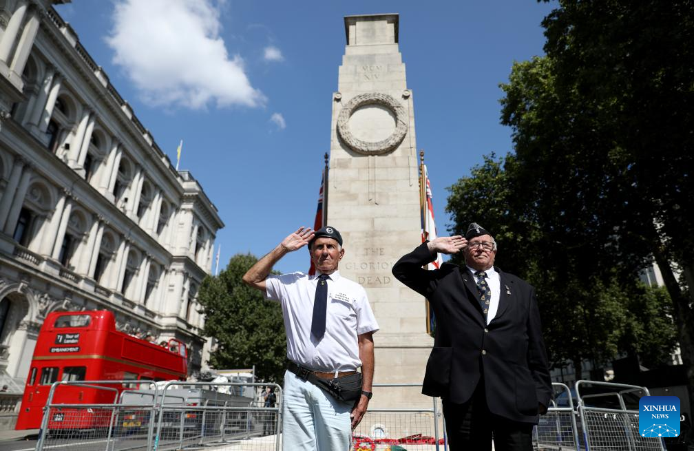 LONDRES, 16 agosto, 2025 (Xinhua) -- Imagen del 15 de agosto de 2025 de dos veteranos saludando frente al Cenotafio, en Londres, Reino Unido. El viernes se celebró en Reino Unido el 80° aniversario del Día de la Victoria sobre Japón con una serie de eventos. (Xinhua/Li Ying)
