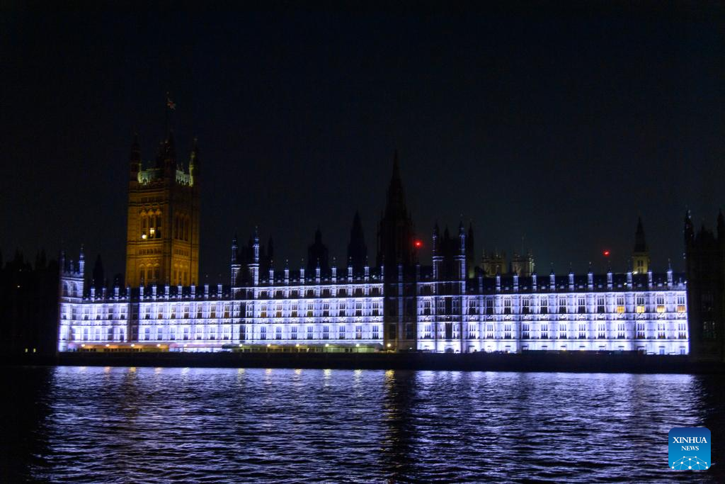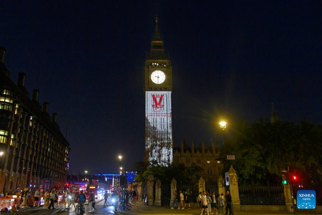 LONDRES, 16 agosto, 2025 (Xinhua) -- Imagen del 15 de agosto de 2025 del Parlamento iluminado para conmemorar el 80° aniversario del Día Británico de la Victoria sobre Japón, en Londres, Reino Unido. El viernes se celebró el 80° aniversario del Día de la Victoria sobre Japón en Reino Unido con una serie de eventos. (Xinhua/Ray Tang)