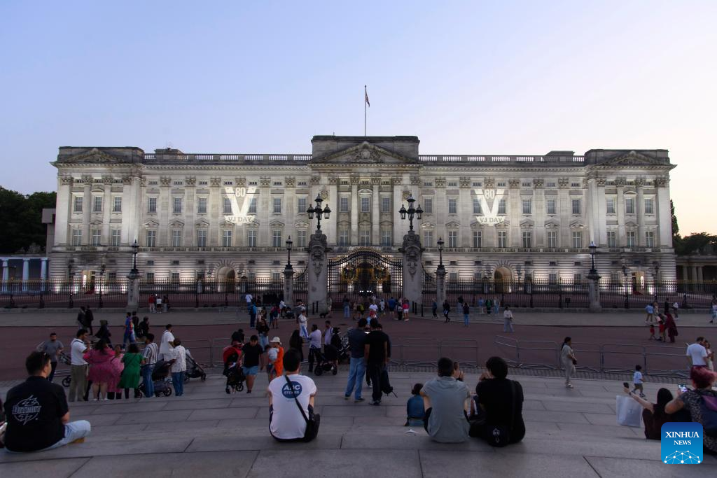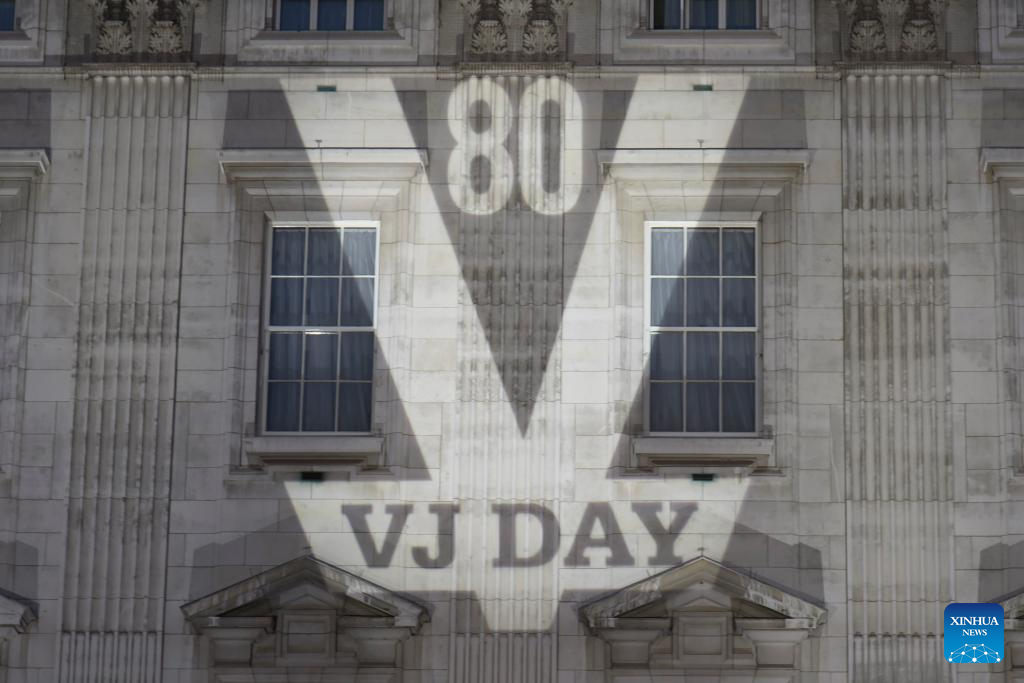 LONDRES, 16 agosto, 2025 (Xinhua) -- Imagen del 15 de agosto de 2025 del Palacio de Buckingham iluminado para conmemorar el 80° aniversario del Día Británico de la Victoria sobre Japón, en Londres, Reino Unido. El viernes se celebró el 80° aniversario del Día de la Victoria sobre Japón en Reino Unido con una serie de eventos. (Xinhua/Ray Tang)