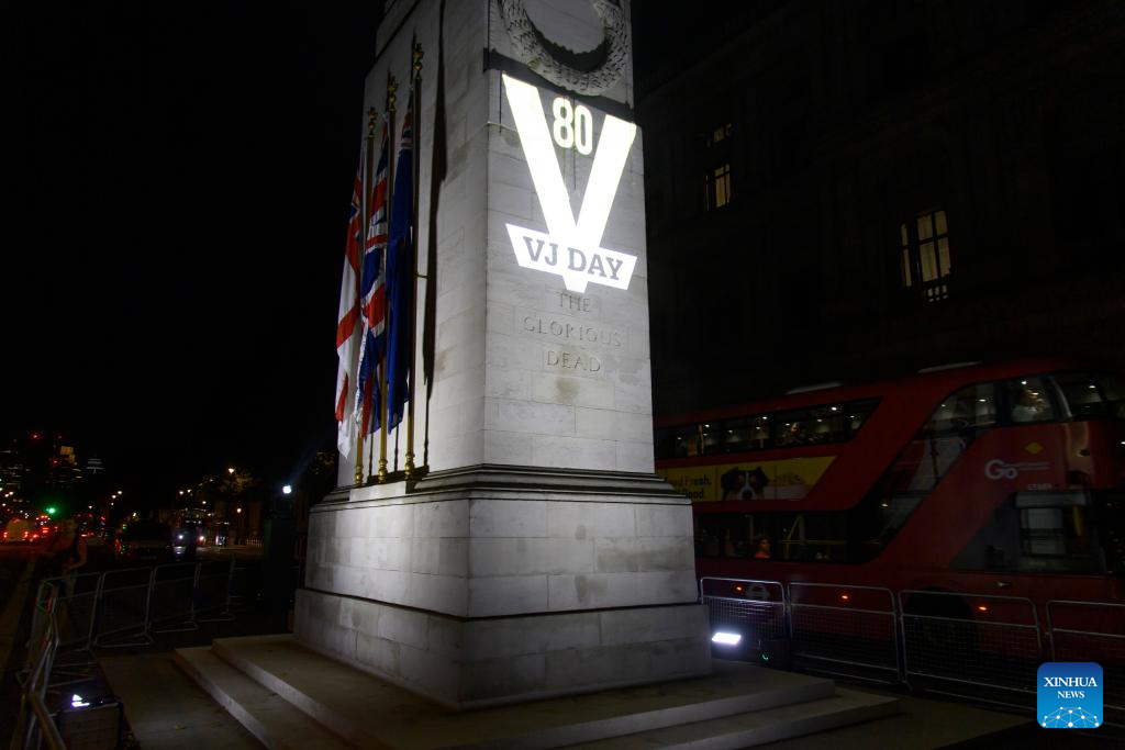 LONDRES, 16 agosto, 2025 (Xinhua) -- Imagen del 15 de agosto de 2025 del Cenotafio iluminado para conmemorar el 80° aniversario del Día Británico de la Victoria sobre Japón, en Londres, Reino Unido. El viernes se celebró el 80° aniversario del Día de la Victoria sobre Japón en Reino Unido con una serie de eventos. (Xinhua/Ray Tang)