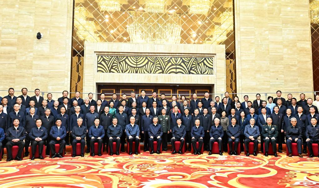 El presidente chino, Xi Jinping, también secretario general del Comité Central del Partido Comunista de China y presidente de la Comisión Militar Central, posa para una fotografía grupal mientras se reúne con representantes de cuadros que vienen a trabajar a Xizang desde otras partes del país, en Lhasa, en la región autónoma de Xizang, en el suroeste de China, el 20 de agosto de 2025. (Xinhua/Li Xiang)