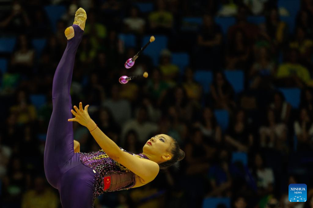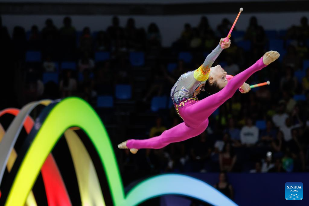 RIO DE JANEIRO, 25 agosto, 2025 (Xinhua) -- Imagen del 24 de agosto de 2025 de Wang Zilu, de China, compitiendo durante la final individual de mazas, en el 41º Campeonato Mundial de Gimnasia Rítmica de la FIG, en Río de Janeiro, Brasil. (Xinhua/Claudia Martini)