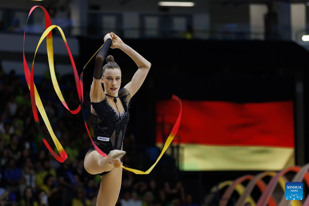 RIO DE JANEIRO, 25 agosto, 2025 (Xinhua) -- Imagen del 24 de agosto de 2025 de Darja Varfolomeev, de Alemania, compitiendo durante la final individual de cintas en el 41º Campeonato Mundial de Gimnasia Rítmica de la FIG, en Río de Janeiro, Brasil. (Xinhua/Claudia Martini)