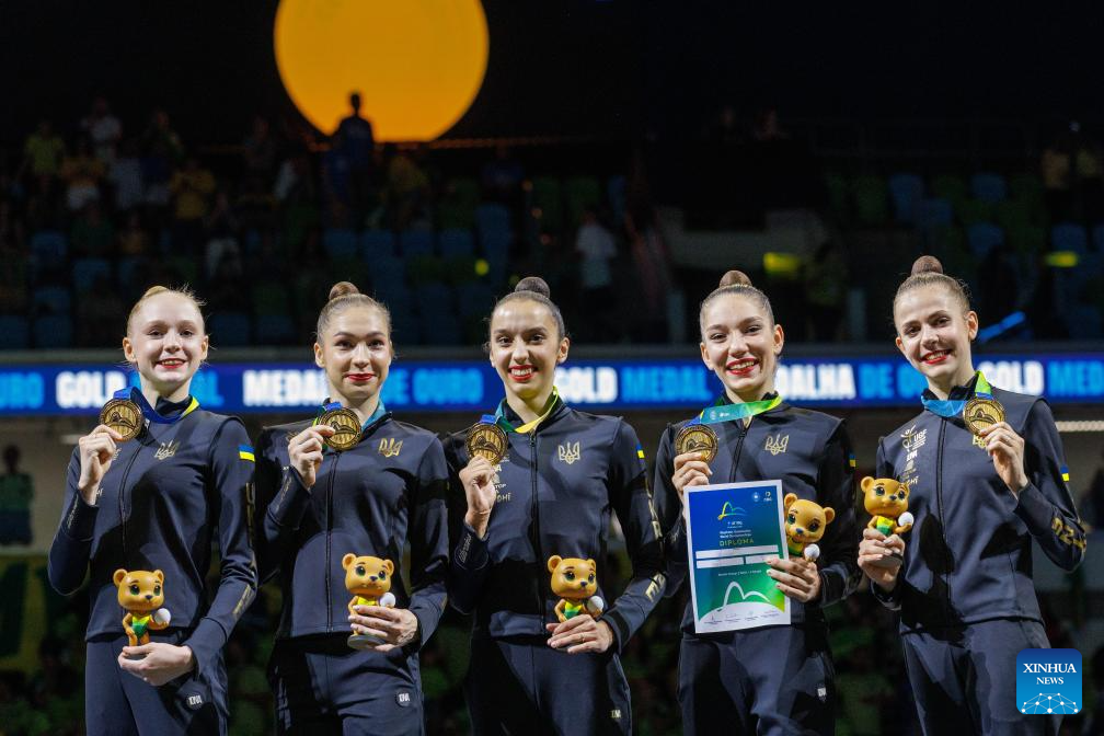 RIO DE JANEIRO, 25 agosto, 2025 (Xinhua) -- Imagen del 24 de agosto de 2025 de las medallistas de oro, el equipo de Ucrania, posando con sus medallas durante la ceremonia de premiación de la final de 3 pelotas y dos aros grupal, en el 41º Campeonato Mundial de Gimnasia Rítmica de la FIG, en Río de Janeiro, Brasil. (Xinhua/Claudia Martini)