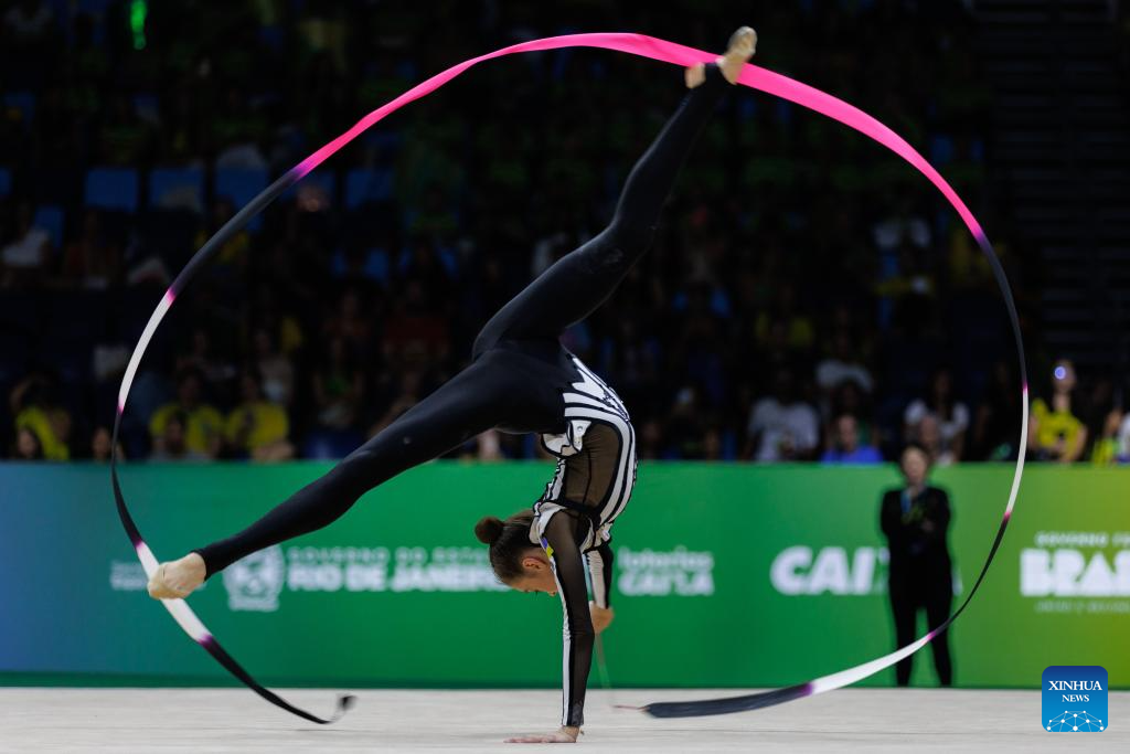 RIO DE JANEIRO, 25 agosto, 2025 (Xinhua) -- Imagen del 24 de agosto de 2025 de Taisiia Onofriichuk, de Ucrania, compitiendo durante la final individual de cintas en el 41º Campeonato Mundial de Gimnasia Rítmica de la FIG, en Río de Janeiro, Brasil. (Xinhua/Claudia Martini)