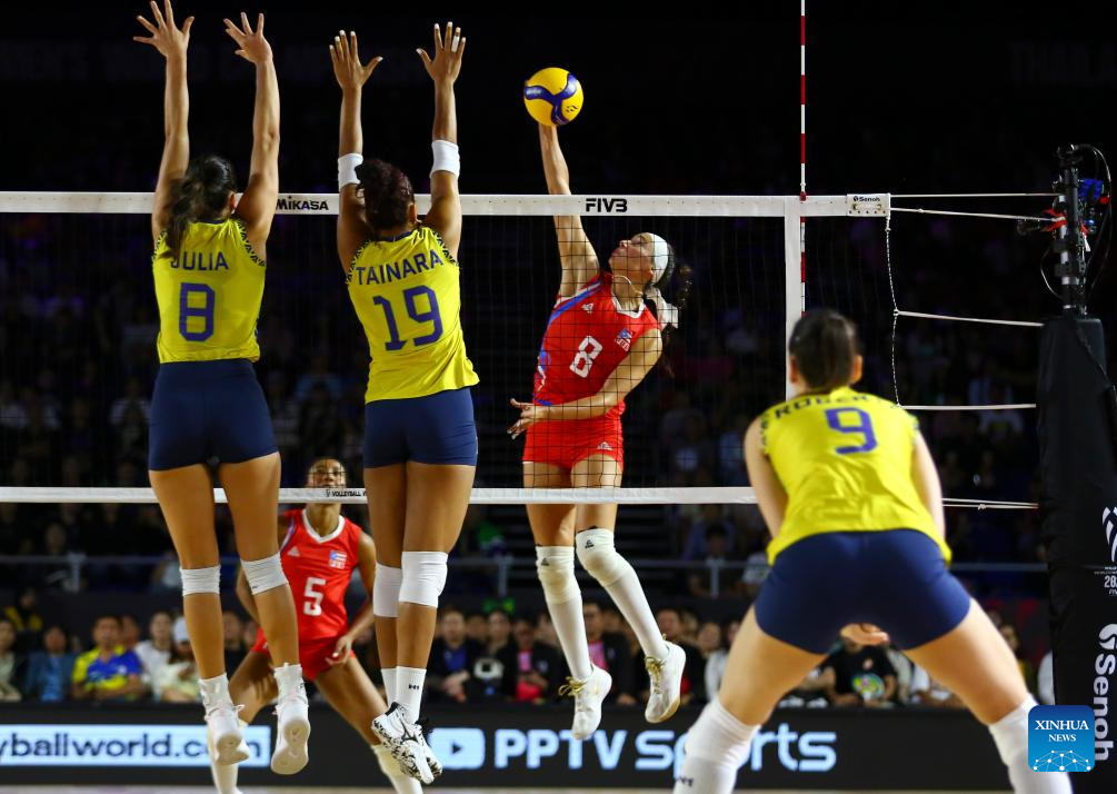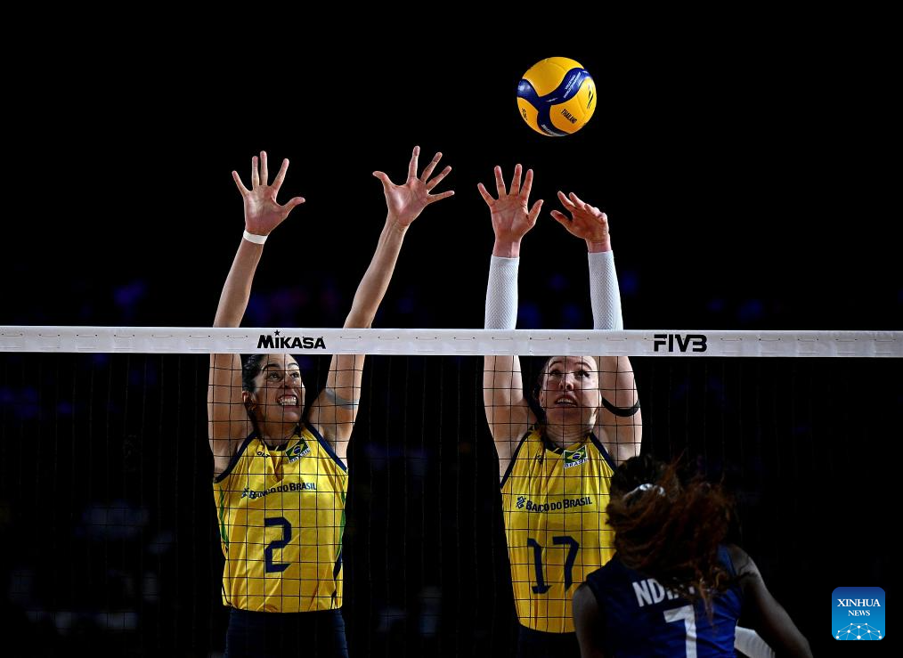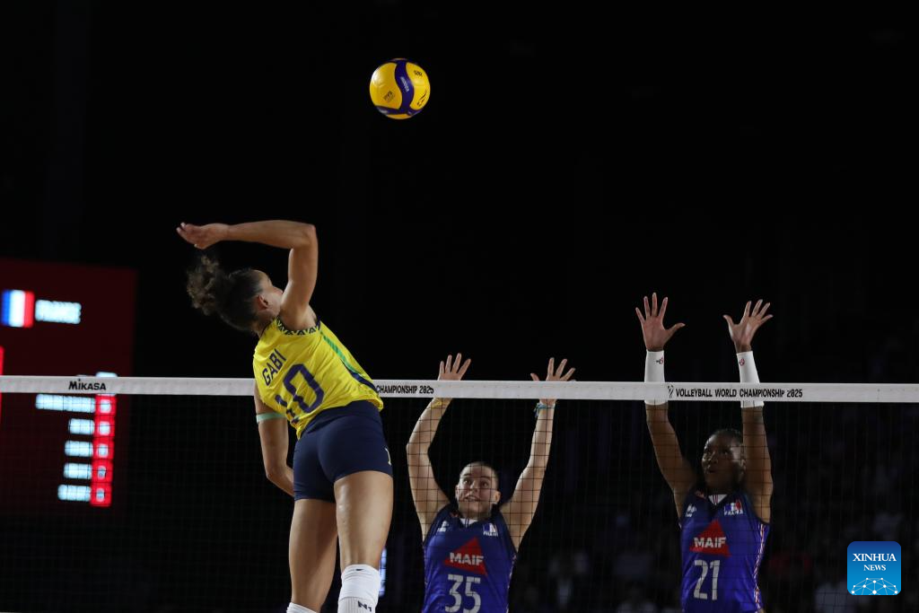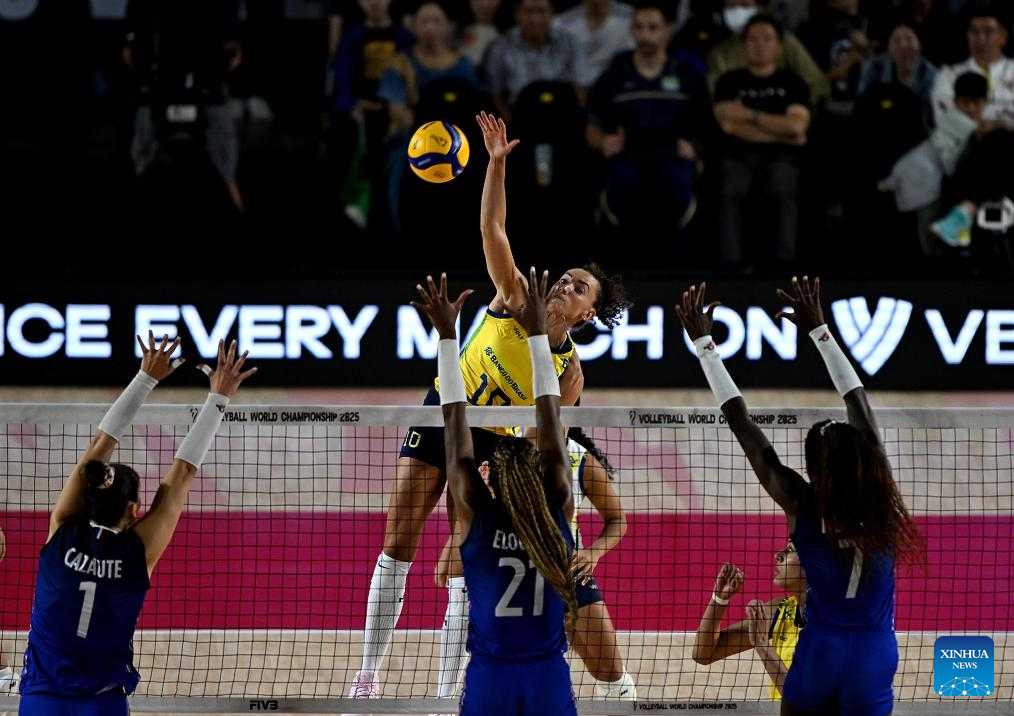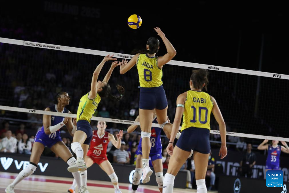 CHIANG MAI, 25 agosto, 2025 (Xinhua) -- Imagen del 24 de agosto de 2025 de Gabriela Braga Guimaraes (i), de Brasil, clavando el balón durante el partido del grupo C de la fase preliminar entre Brasil y Francia, en el Campeonato Mundial de Voleibol Femenino, en Chiang Mai, Tailandia. (Xinhua/Sun Weitong)