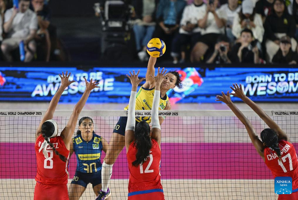 CHIANG MAI, 26 agosto, 2025 (Xinhua) -- Gabriela Braga Guimaraes (arriba), de Brasil, clava el balón durante el partido del grupo C de la fase preliminar entre Brasil y Puerto Rico en el Campeonato Mundial de Voleibol Femenino en Chiang Mai, Tailandia, el 26 de agosto de 2025. (Xinhua/Hou Zhaokang)