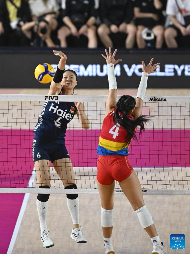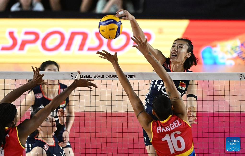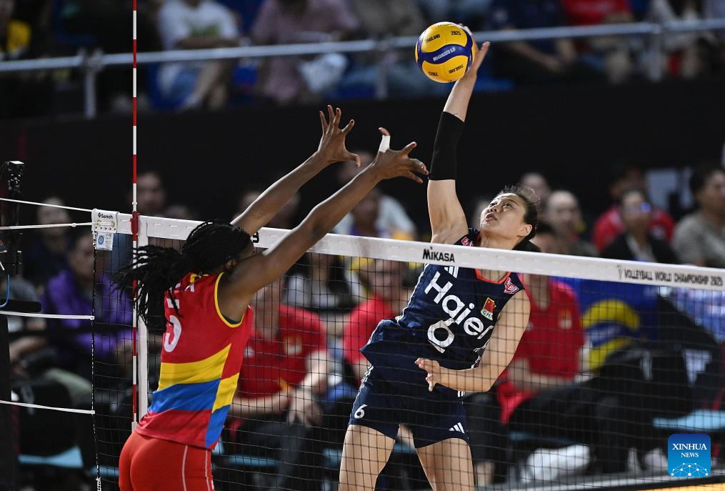 CHIANG MAI, 25 agosto, 2025 (Xinhua) -- Wang Yuanyuan (d-arriba), de China, clava el balón durante el partido del grupo F de la fase preliminar entre China y Colombia, en el Campeonato Mundial de Voleibol Femenino, en Chiang Mai, Tailandia, el 25 de agosto de 2025. (Xinhua/Hou Zhaokang)