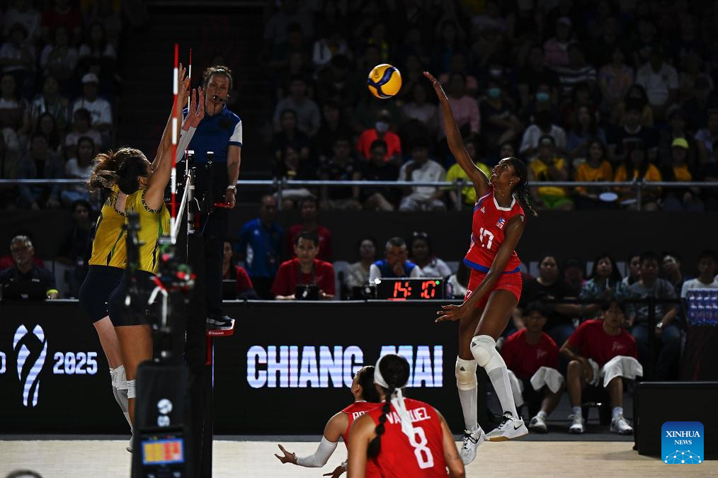 CHIANG MAI, 26 agosto, 2025 (Xinhua) -- Decelise Annalee Champion (d-arriba), de Puerto Rico, clava el balón durante el partido del grupo C de la fase preliminar entre Brasil y Puerto Rico en el Campeonato Mundial de Voleibol Femenino en Chiang Mai, Tailandia, el 26 de agosto de 2025. (Xinhua/Hou Zhaokang)