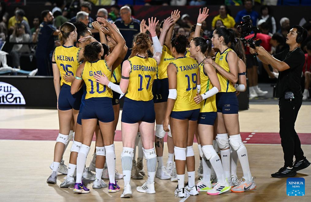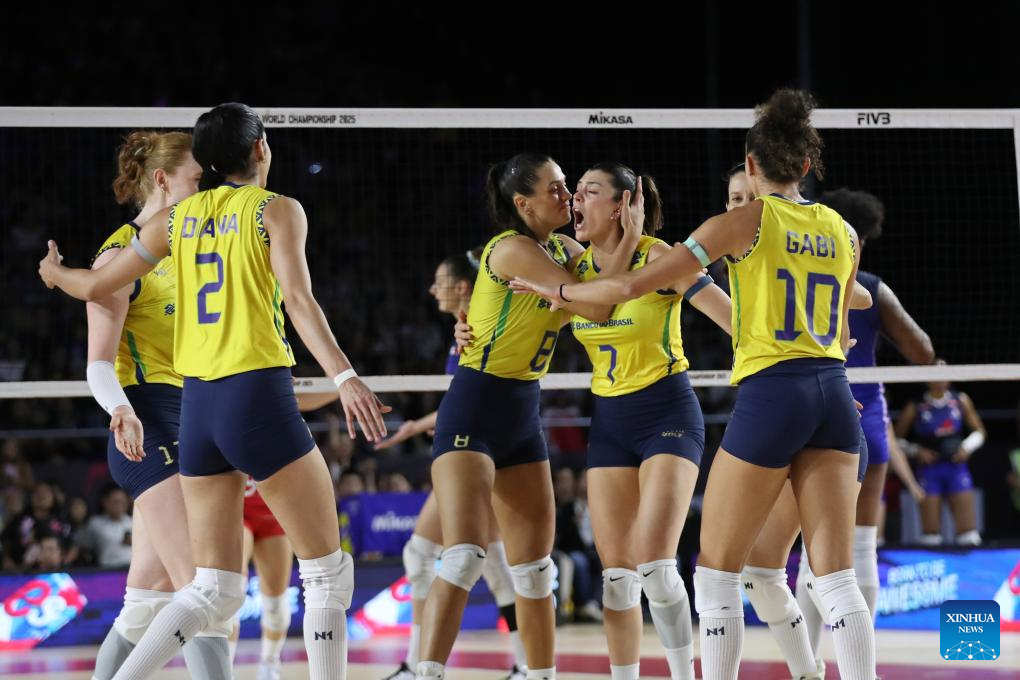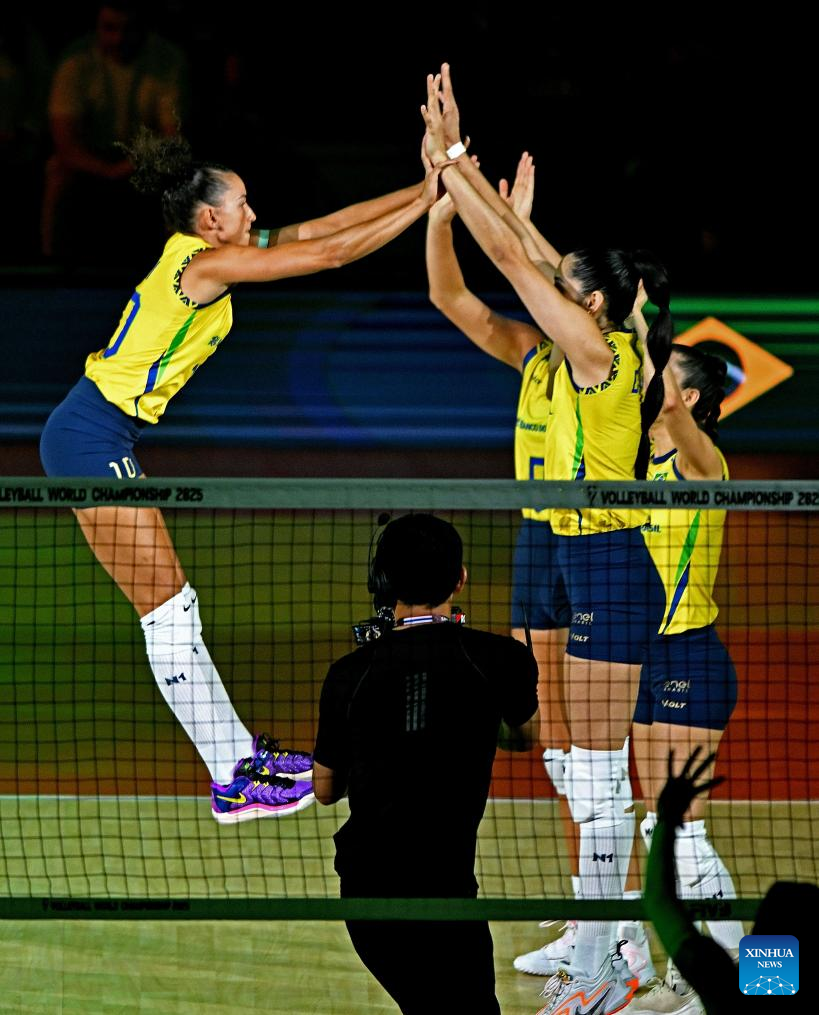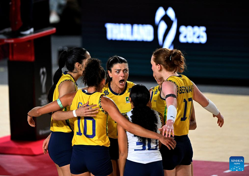 CHIANG MAI, 26 agosto, 2025 (Xinhua) -- Gabriela Braga Guimaraes (i-arriba), de Brasil, anima con sus compañeras durante el partido del grupo C de la fase preliminar entre Brasil y Puerto Rico en el Campeonato Mundial de Voleibol Femenino en Chiang Mai, Tailandia, el 26 de agosto de 2025. (Xinhua/Hou Zhaokang)