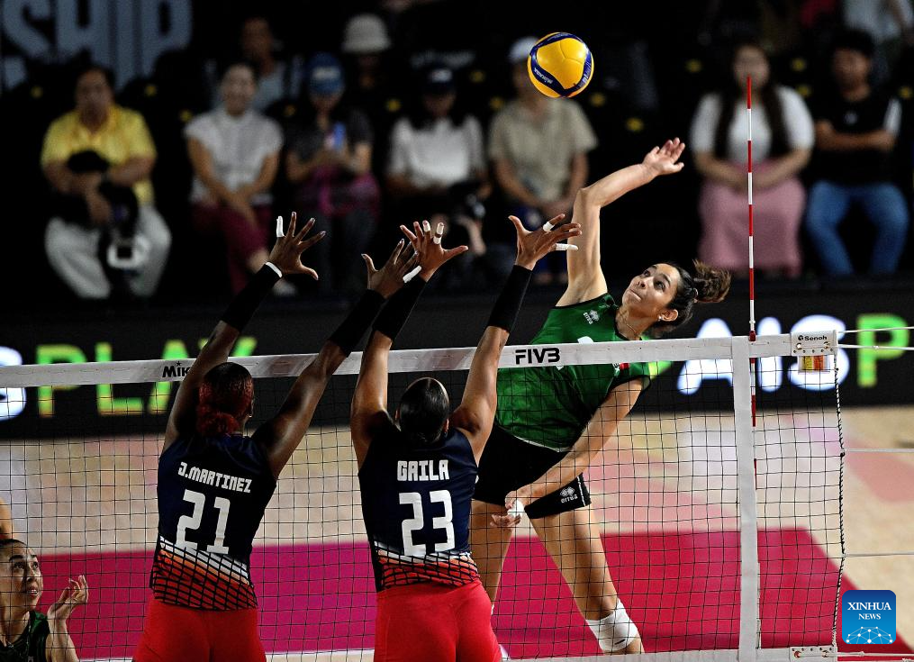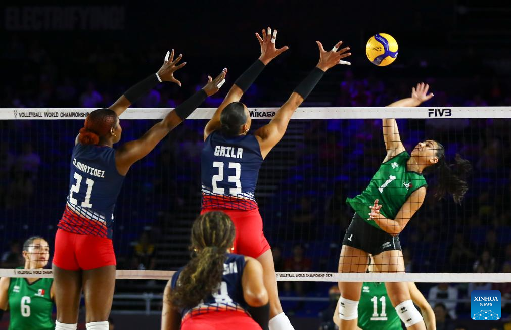CHIANG MAI, 25 agosto, 2025 (Xinhua) -- Uxue Amaya Guereca Parra (d-arriba) de México, compite durante el partido del grupo F de la fase preliminar entre República Dominicana y México, en el Campeonato Mundial de Voleibol Femenino, en Chiang Mai, Tailandia, el 25 de agosto de 2025. (Xinhua/Sun Weitong)