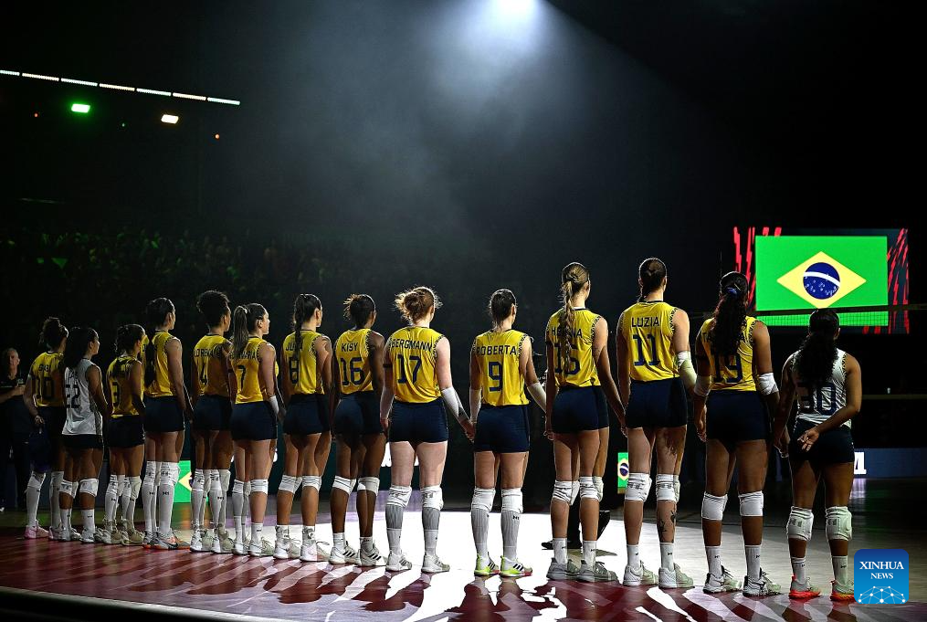 CHIANG MAI, 25 agosto, 2025 (Xinhua) -- Imagen del 24 de agosto de 2025 de las jugadoras de Brasil alineándose para escuchar el himno nacional previo al partido del grupo C de la fase preliminar entre Brasil y Francia, en el Campeonato Mundial de Voleibol Femenino, en Chiang Mai, Tailandia. (Xinhua/Hou Zhaokang)